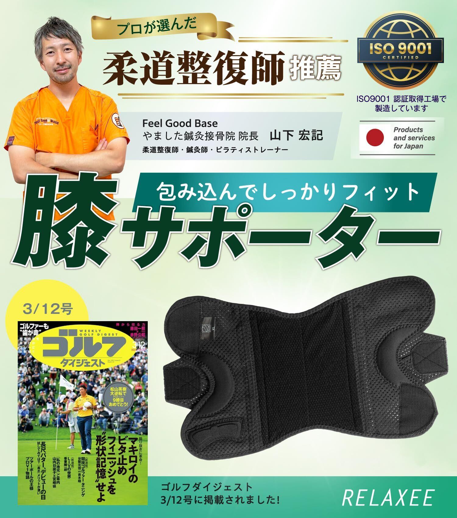 【徹底した品質管理】RELAXEE膝サポーターはISO9001認証取得工場で製造されております。お客様に安心して商品をご使用頂く為、徹底した品質管理の下で製造・検品させて頂いております。