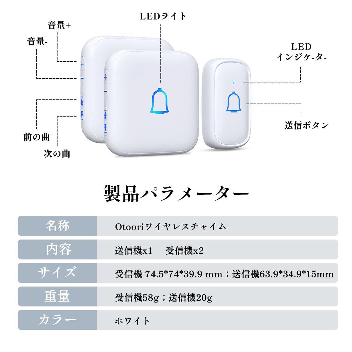 Otoori ワイヤレスチャイム 玄関チャイム IP66防水防塵 送信機電池式 60種以上メロディー 配線不要 受信機コンセント 7段階音量調節 音と光で呼び出し 300M無線範囲 メモリ機能 増設可能 LED提示 インターホン(白 1送信機 2受信機)