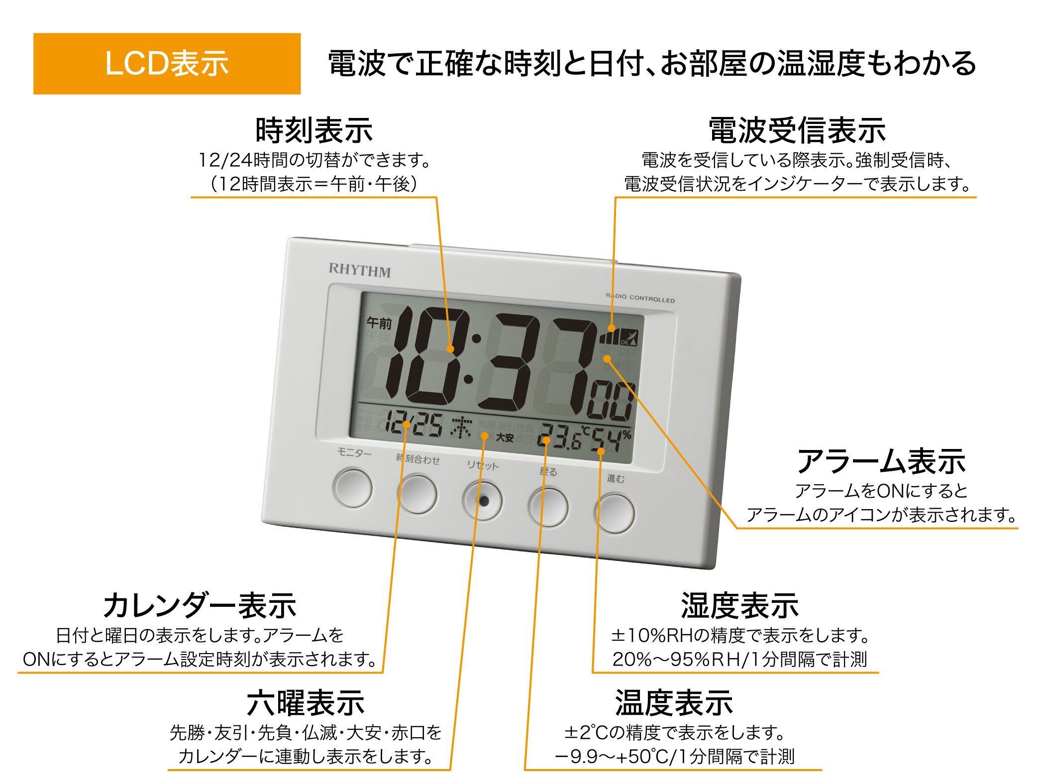 特徴 スヌーズ, カレンダー表示, 湿度表示, 温度表示, 目覚まし時計