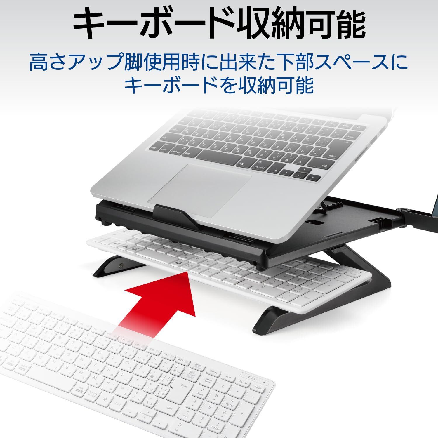 高さアップ脚を利用すればノートPCスタンドの下のスペースを有効活用でき、ノートPCスタンドの下のスペースにキーボードを収納することができます。