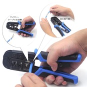 VCE RJ45 かしめ工具(ネットワーク・電話用統合型圧着ツール)は、RJ45、RJ11/RJ12、RJ22 のモジュラープラグに対応した切断・剥線・圧着が可能です。1 台で設置作業を一括解決できます