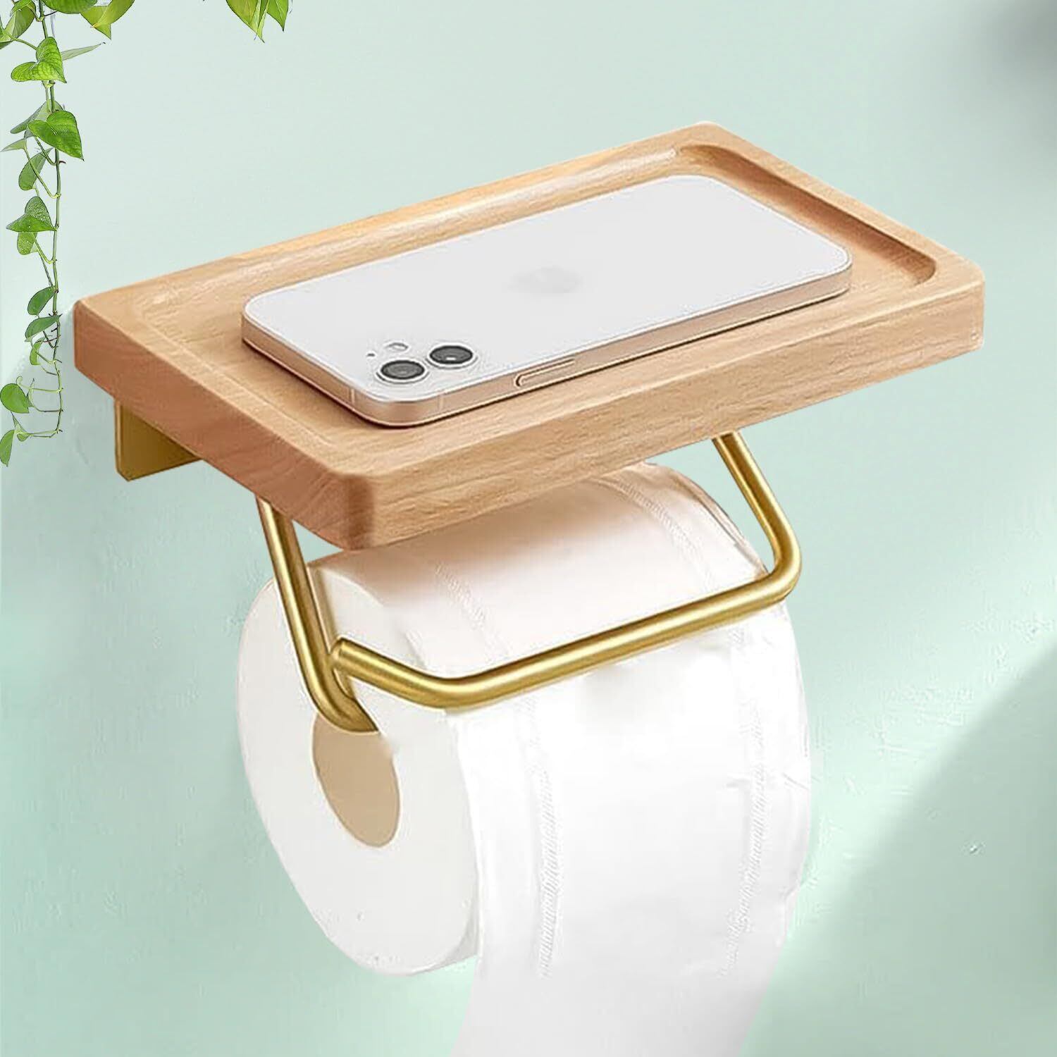 【在庫セール】lanzoub トイレットペーパーホルダー 木製 棚付き スマホ置き インテリア 紙巻器 壁掛け 小物置き トイレペーパーホルダー 榉木&太空アルミ アンティーク調 おしゃれ ペーパーホルダー 穴あけ不要 取付簡単 和風 汚れに強い天板 上質 (B型 ダブルフック) | allstore3