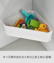 バスルームのコーナーにマグネットで簡単取り付けのおもちゃラック。
