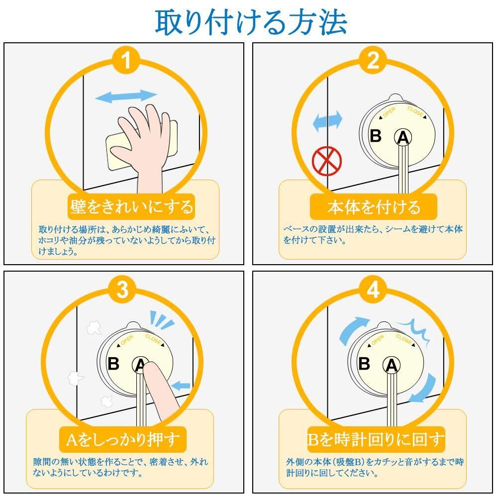 取り付け場所:ガラス、金属タイプ、タイル、アクリル板など平滑でつるつるした面にしっかり吸着!凹凸なところ及びタイルとタイルの間などの隙間のあるところに取り付けられません。そして、壁紙を貼った壁にも使わないでください。
