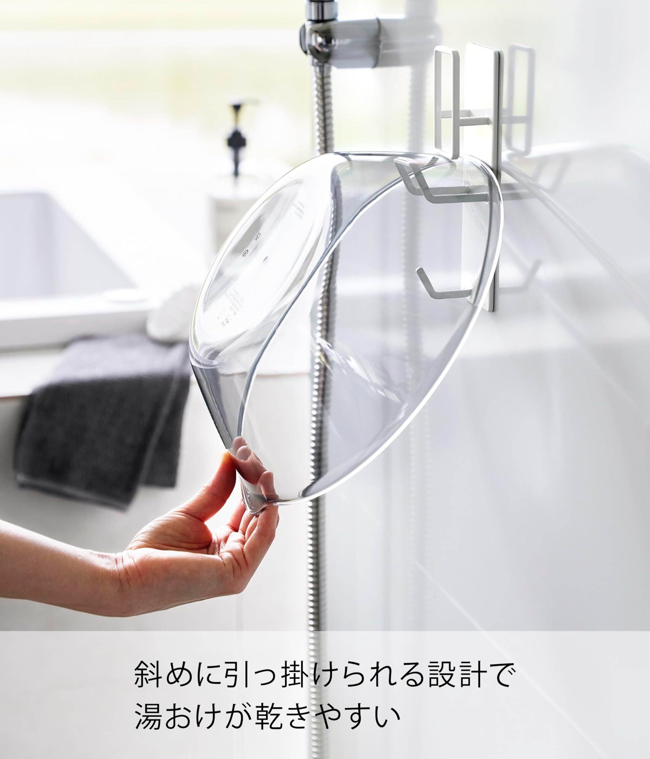 湯おけは、乾きやすいように斜めに引っ掛けられる設計。