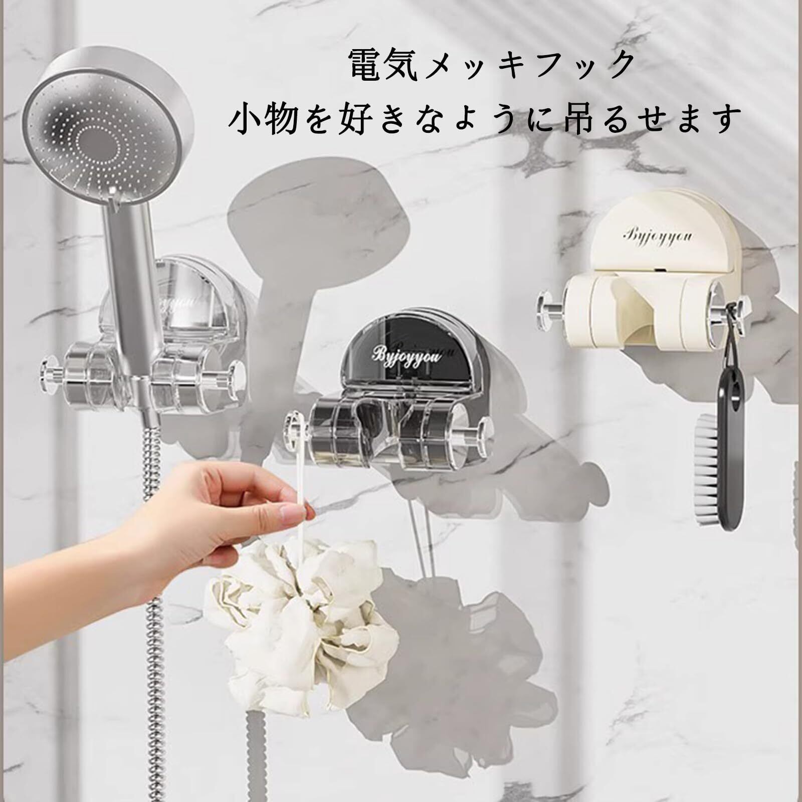 【浴室で便利なシャワーフック】シャワーヘッドの向きを好みに合わせて自在に変えることができる、便利なシャワーフックが誕生しました。浴室内の壁面の好きな場所に貼り付けるだけで、いつものシャワータイムを快適により過ごすことができます。シンプルなデザイン性のため、バスルーム内にも自然と馴染みます。