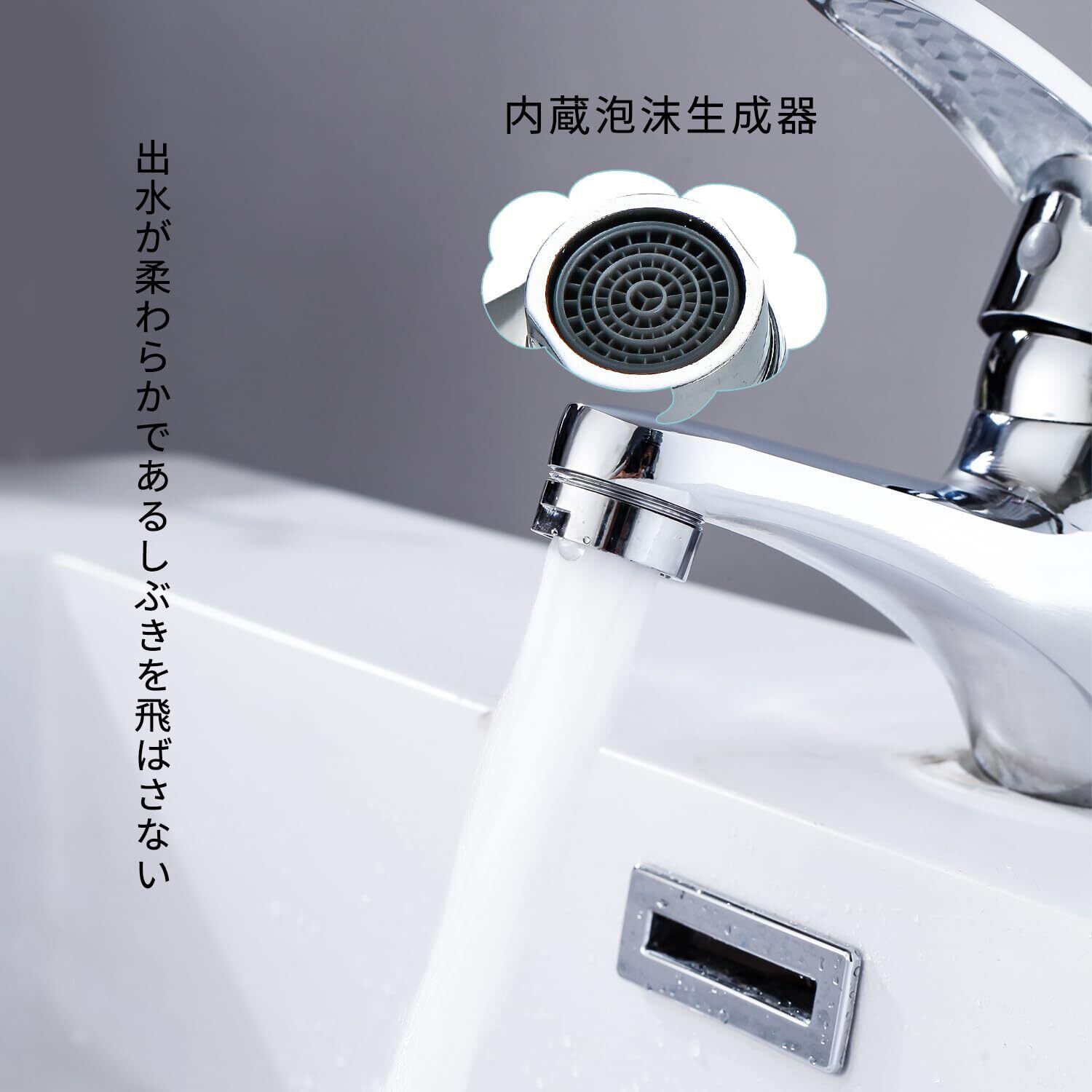 【泡沫生成器&飛沫なし】 洗面台水栓の注ぎ口には泡沫生成器が採用されており、柔らかな泡沫水流が水の飛散を防止し、水流音を抑えます。シンプルで使い勝手の良いハンドル式単水栓です。