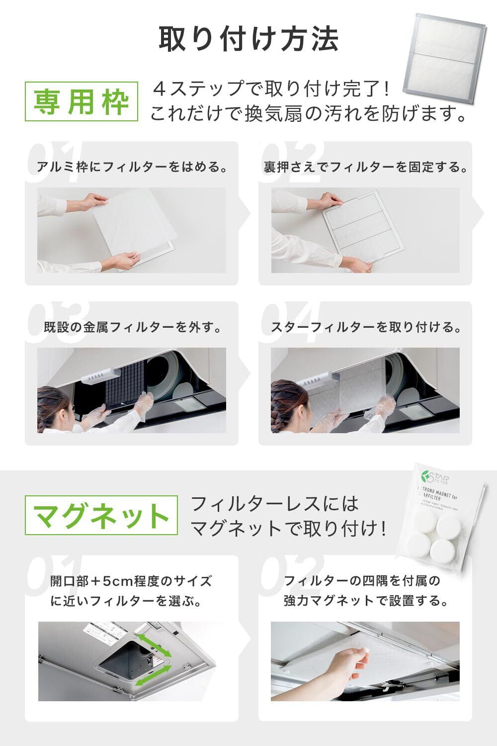 【入れ替えるだけの簡単お手入れ】多くのご家庭のレンジフードに備え付けられている金属フィルターをスターフィルターに取り替えて設置は完了です。これだけで換気扇のきれいが長持ちし、お手入れが劇的にラクに。フィルターレスタイプの場合はマグネットで取り付けられます。