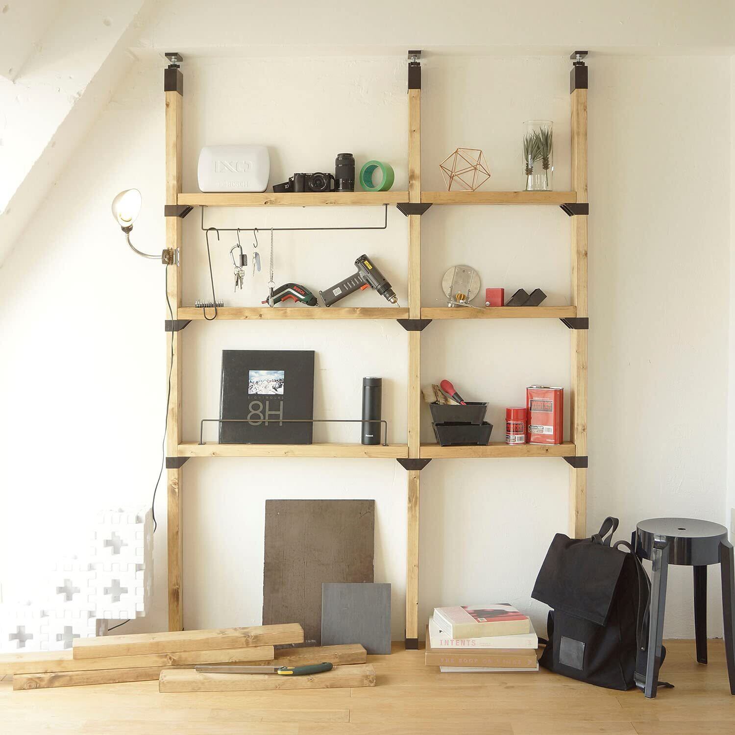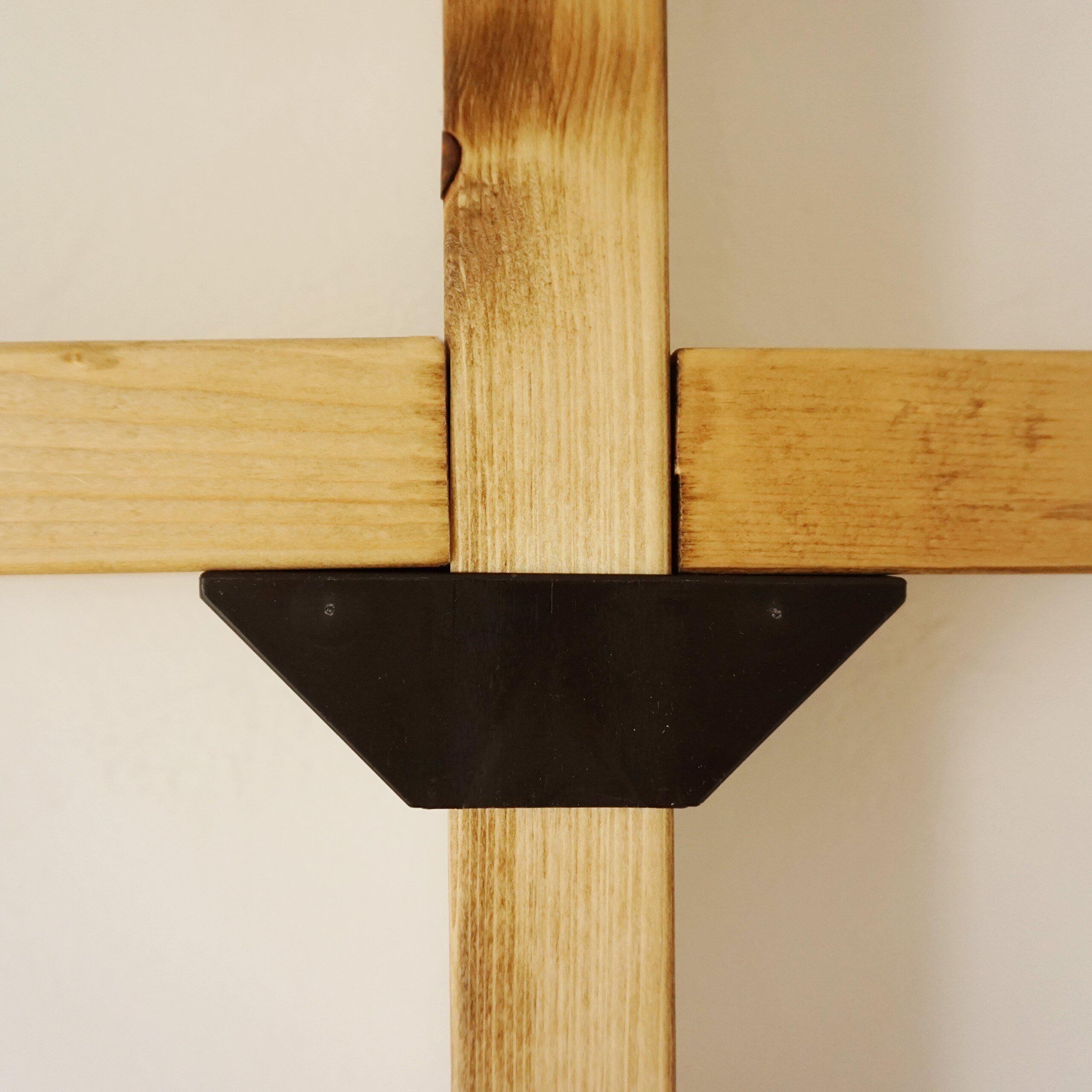 2×4木材の柱に棚を取り付けるための棚受けパーツ。柱の両側に棚を付けたい時、このパーツ1つで取付けできます。