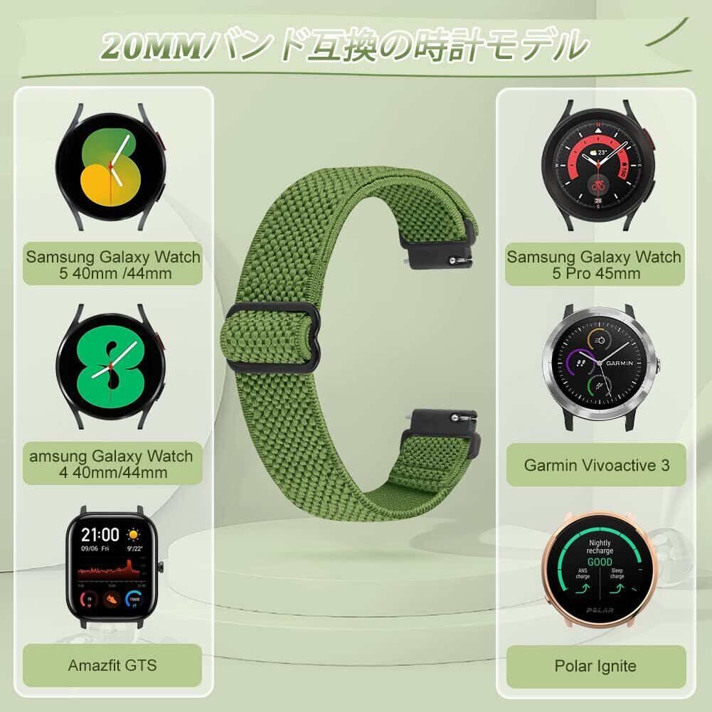 互換性のあるモデル:20mm弾性ベルトは、20 mmラグのあるすべての時計に対応しています。例えば、Samsung Galaxy Watch 7/6/5/4 44mm 40mm, Galaxy Watch FE 40mm, Galaxy Watch 6 Classic 43mm 47mm, Galaxy Watch 5 Pro 45mm, Galaxy Watch 4 Classic 42mm/46mm, Galaxy Watch 3 (41mm)/Galaxy Watch 42mm/Gear S2 Classic/Galaxy Watch Active 40mm/Galaxy Watch Active2 40mm/44mm; Garmin Vívoactive 5/Vivoactive 3/Venu/Venu 2 Plus/Venu Sq/Sq 2/Sq Music;Amazfit Active 2;Amazfit Active等。