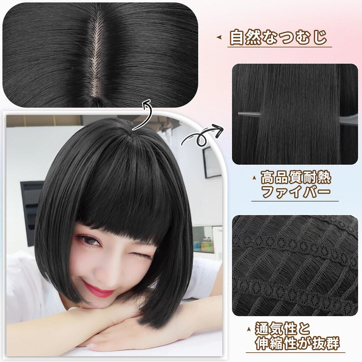 【ウィッグの勧め】① 自然なつむじ: 肌色の人工スキンで自然な分け目を再現しているから、近くで見られても上から覗かれても気づかれないほど自然です。分け目アレンジも自由自在です②前髪の「ふかし加工」前髪の根元に短い毛を入れた「ふかし加工」で額に張りつかずふんわり!③選べるカラーは6色!自然さを追求した"プリンカラー"と美容室でも人気の"外国人風カラー"を再現こだわりのカラーです。④伸縮性のあるキャップ、長時間着用しても疲れない理由はやわらかいキャップ!襟足のアジャスターで自分ぴったりのサイズに調整できるので安心です⑤耐熱ファイバーを使用しているのでコテ·アイロン使用 OK⑥ボリューム感があり、華やかな印象のボブヘアスタイル⑦小顔効果がありのbobウィッグ、普段使いしやすい、気軽にファッションウィッグを取り入れてオシャレを楽しむ。