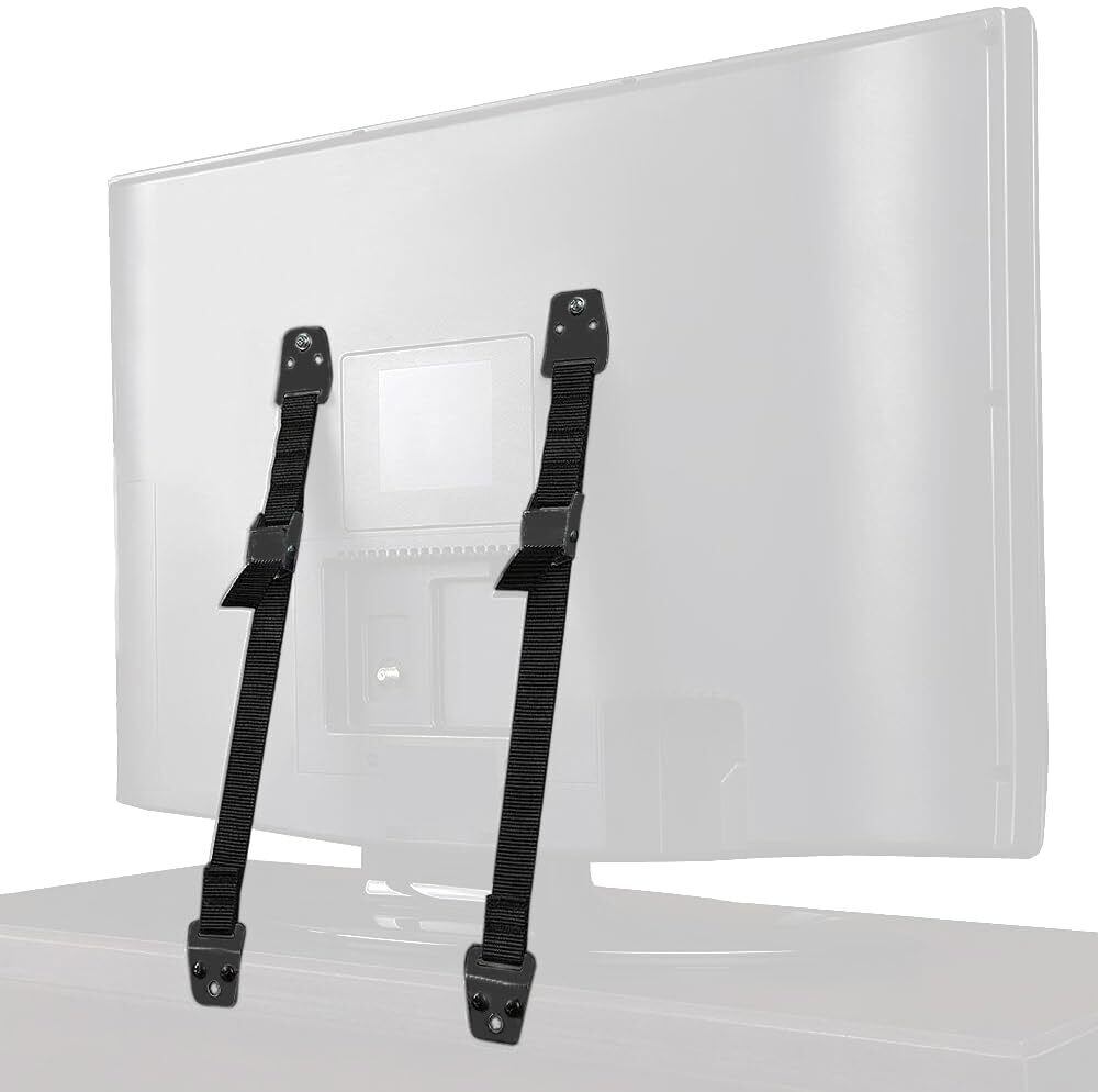 テレビ裏面のVESA穴(壁掛け用取り付けネジ穴)を利用した、テレビの前方への転倒を防止する「ネジどめタイプの耐震ベルト」です。ネジ固定で外れにくいし、操作簡単でとともに安全で信頼性も高いです。