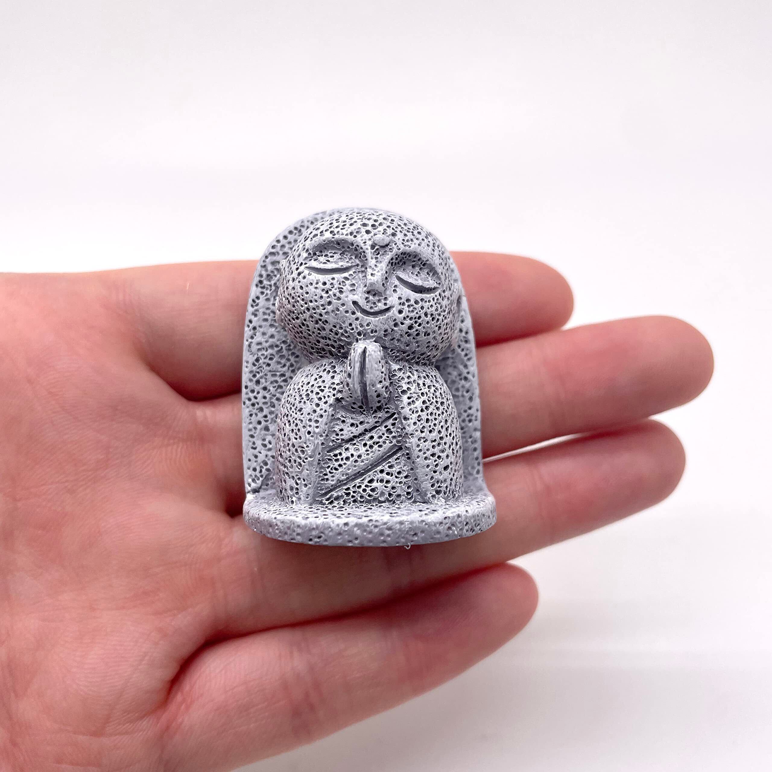 【店主からのメッセージ】:店主は京都の寺院を訪れた際、可愛らしい小さな僧侶や地蔵菩薩の石像を発見し、面白く美しい意味を感じました。帰宅後、名工の彫刻模型を探し、砂岩合成技術を使用して美しい小さな飾りを制作しました,白御影石で作られた手のひらにのせられる小柄なお地蔵さんです。