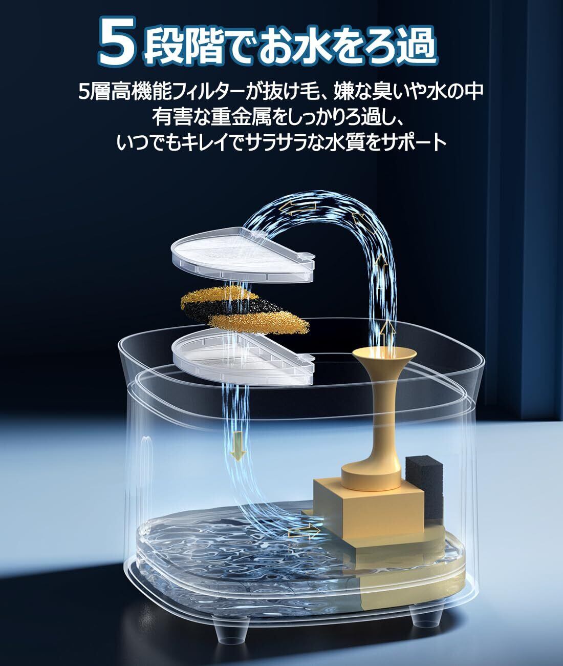 【ヒント】地域によっては水道水にミネラル成分が多く含まれていることがあります。ミネラルが多い水を飲み続けるとワンちゃんや猫ちゃんの胃腸や腎臓、下部尿路などへの健康リスクが高まる可能性があります。浄水ろ過フィルターでミネラルや塩素を大幅にカットし、ワンちゃん猫ちゃんの身体への負担を軽減したおいしいお水を提供します。ABS樹脂製の本体に高密度マイクロ綿、ヤシ殻活性炭、イオン交換樹脂、KDF(銅と亜鉛の合金)を組み合わせた高品質な浄水フィルターです。
