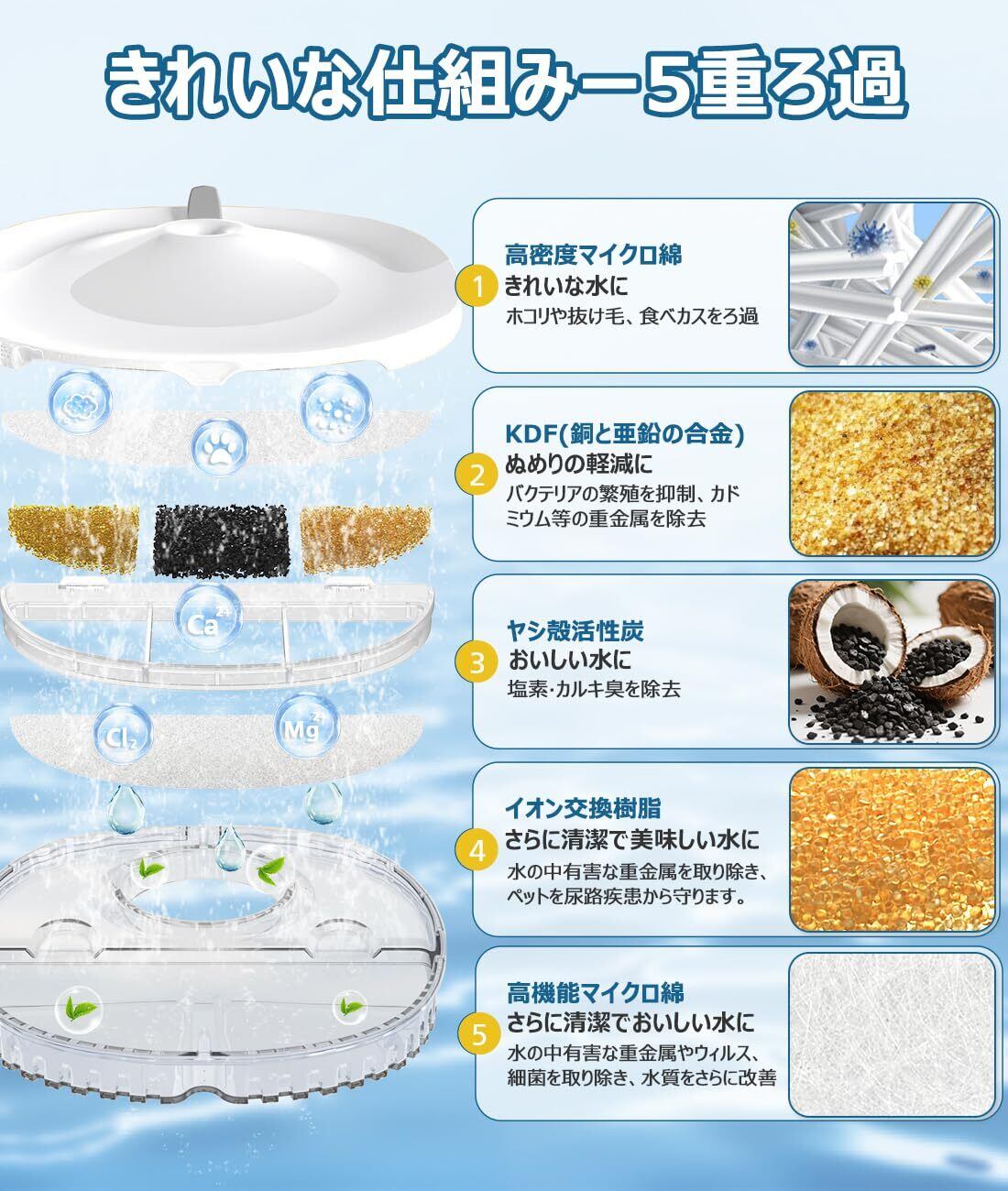 【獣医師監修】5層高機能フィルターが抜け毛、嫌な臭いや水の中有害な重金属をしっかりろ過し、いつでもキレイでサラサラな水質をサポートする。新素材 KDF(銅と亜鉛の合金)ぬめり軽減成分配合! ワンちゃん・猫ちゃんの健康は日々のキレイなお水から シリーズ交換用フィルター