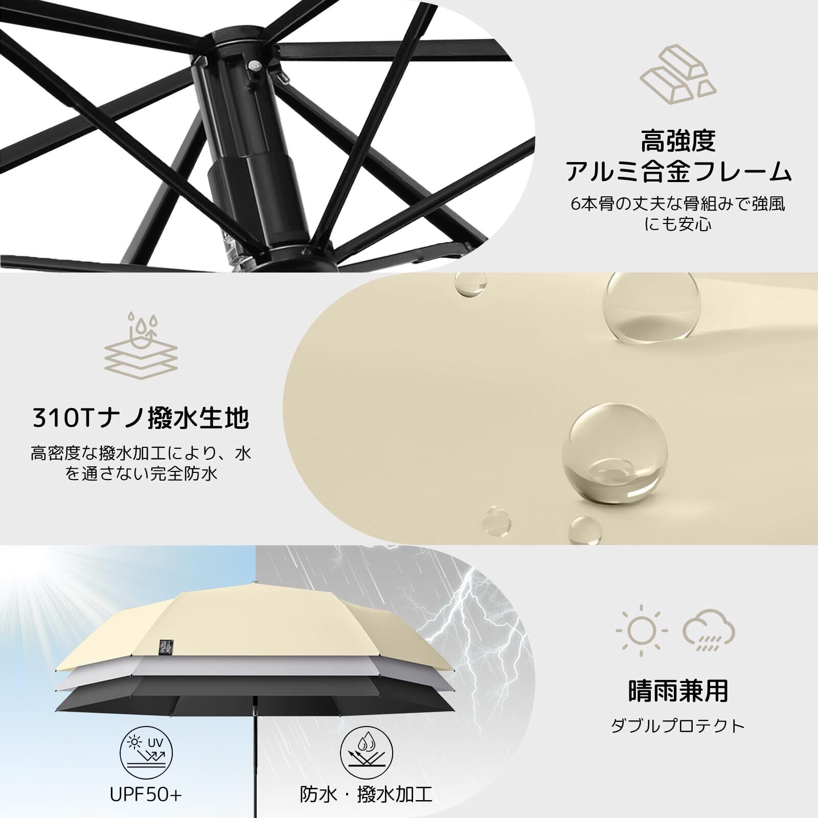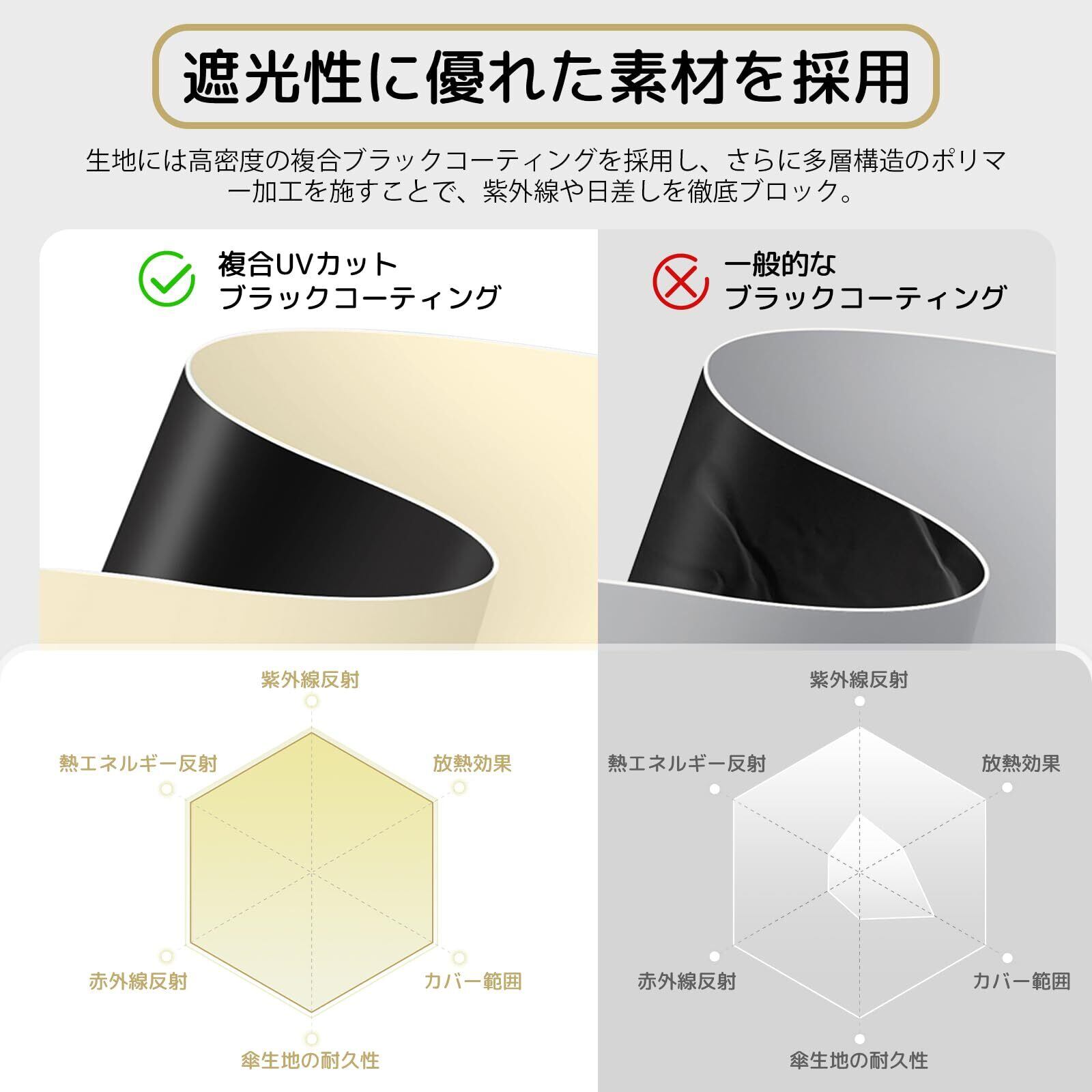 【310Tブラックコーティング&高性能UVカット】高密度で丈夫な310Tのブラックコーティング生地を使用し、UPF50+、UVカット100%。完全遮光、強い日差しからお肌をしっかり守ります。さらに、特殊な遮熱加工により傘の下の体感温度を約6℃も下げるため、真夏の炎天下でも涼しく快適に過ごせます。紫外線による日焼けや熱中症のリスクを軽減し、長時間の屋外活動でも安心です。