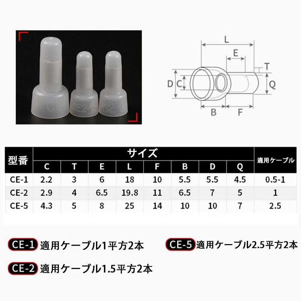 1.【高品質素材】導体はアルミニウム、絶縁体はナイロンで、耐腐食性と耐久性に優れ、振動から接続を保護します。 2.【使い方は簡単】1、2本のワイヤーを引きちぎり、閉じたコネクターに挿入;2、閉じたコネクターをプライヤーで押さえる;3、ワイヤーとコネクターの接続が完了。 3.【実用的なデザイン】電気接続ポイントをしっかりと固定するために使用され、使いやすく、電気接続を迅速かつ簡単にします。 22~10AWGのソリッドおよび撚り線を使用できます。 4.【幅広い用途】さまざまなタイプの安全装置、カーステレオなどに使用できます。 電線の端を絶縁することで電線のショートを防ぎ、単線と多線のアプリケーションに対応するため、単線と撚り線の組み合わせを受け入れます。 5.【パッケージ内容】CE-1(AWG 22-16、0.5-1.5 mm²)130個、CE-2(AWG 16-14、1.5-2.5 mm²)90個、CE-5(AWG-10、4-6 mm²)30個、合計250個をお届けします。