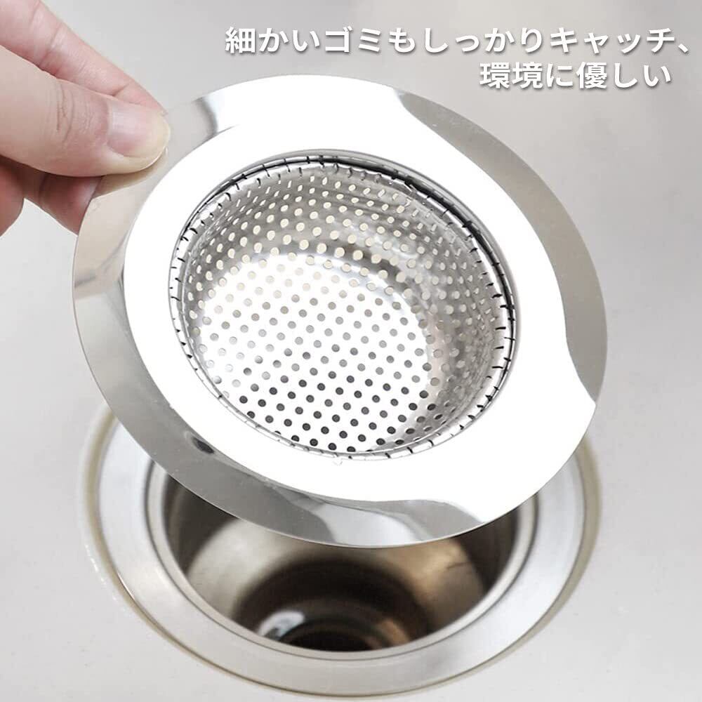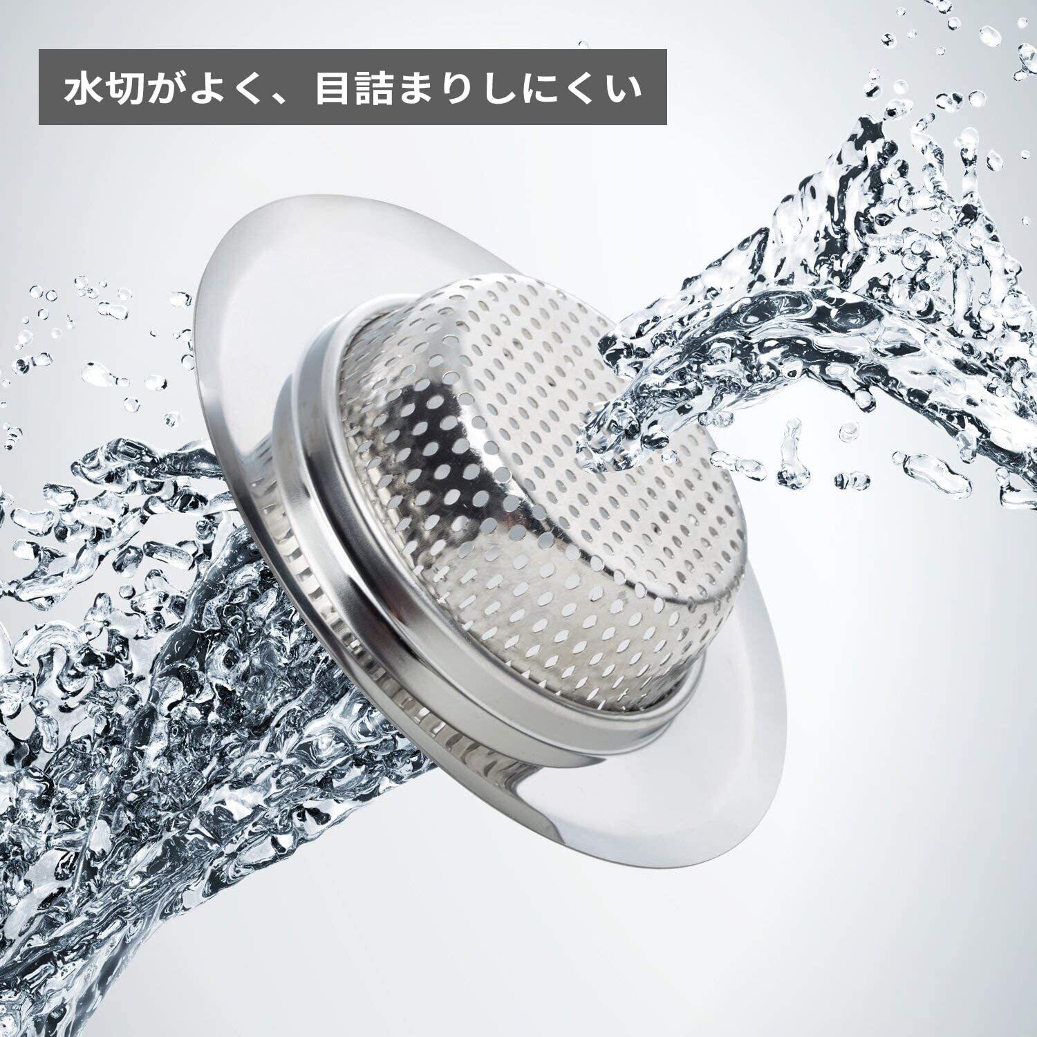 【水切がよく、目詰まりしにくい】流し台ゴミ受けは網目ではなくパンチング板材を使用しています。水切れがよく、目詰まりしにくい、細かいゴミもしっかりキャッチします。シンク排水口に取付けるだけで、排水パイプのつまりを防ぎます。