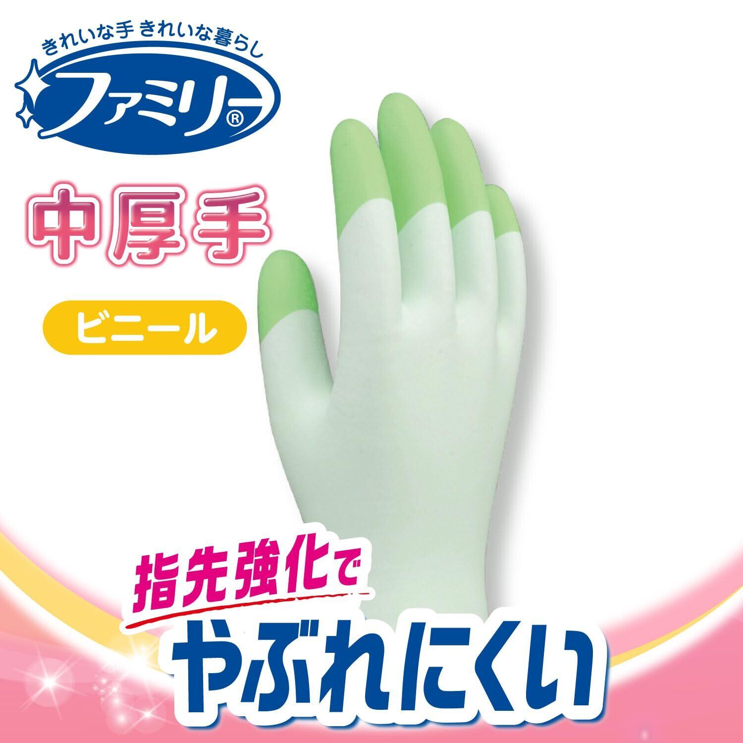 ファミリー [まとめ買い] ビニール手袋 中厚手 指先強化 Mサイズ グリーン×4個 キッチン 食器洗い 掃除 洗濯 ガーデニング ビニール 手袋