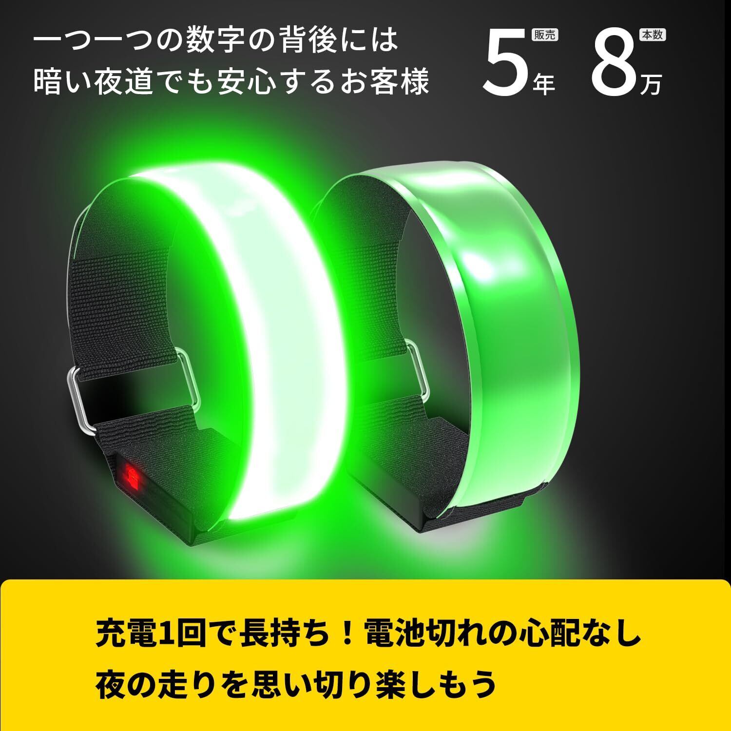 ランニングライト 充電式 長持ち 夜間スポーツ用 ジョギング ウォーキング LEDアームバント 安全確保 高輝度 ベルト 夜間の事故防止 回避 反射材 グマジックテープ 伸縮性あり 着用心地いい (グリーン2本セット)