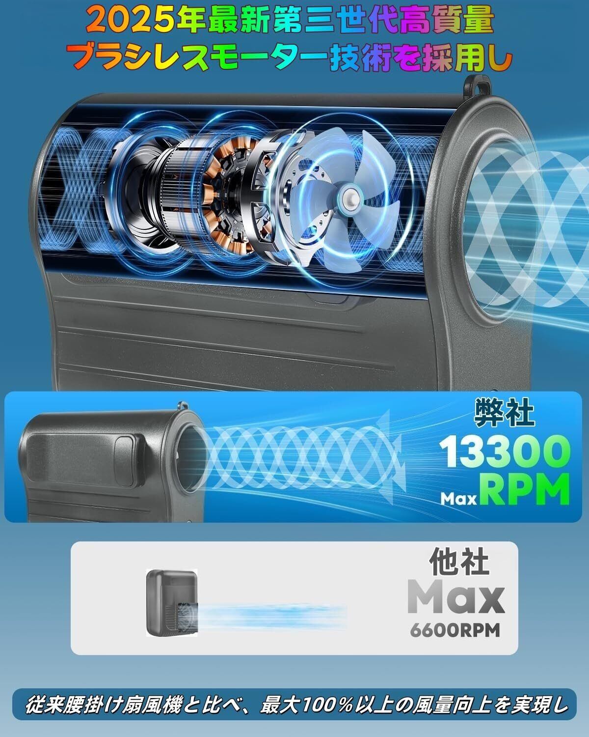 【高品質ブラシレスDCモーター・低騒音設計】新先端1100rpmのブラシレスDC静音モーターを採用、10m/sの強力な風を実現します!強力な風量を確保しながら、くびかけ扇風機の駆動音はわずか25dBと超静音を実現し、従来のブラシ付きDCモーターと比べて、耐久性が高く長持ち、ハイパワー、静かで低ノイズな動作音といった優れた特徴を持っています。