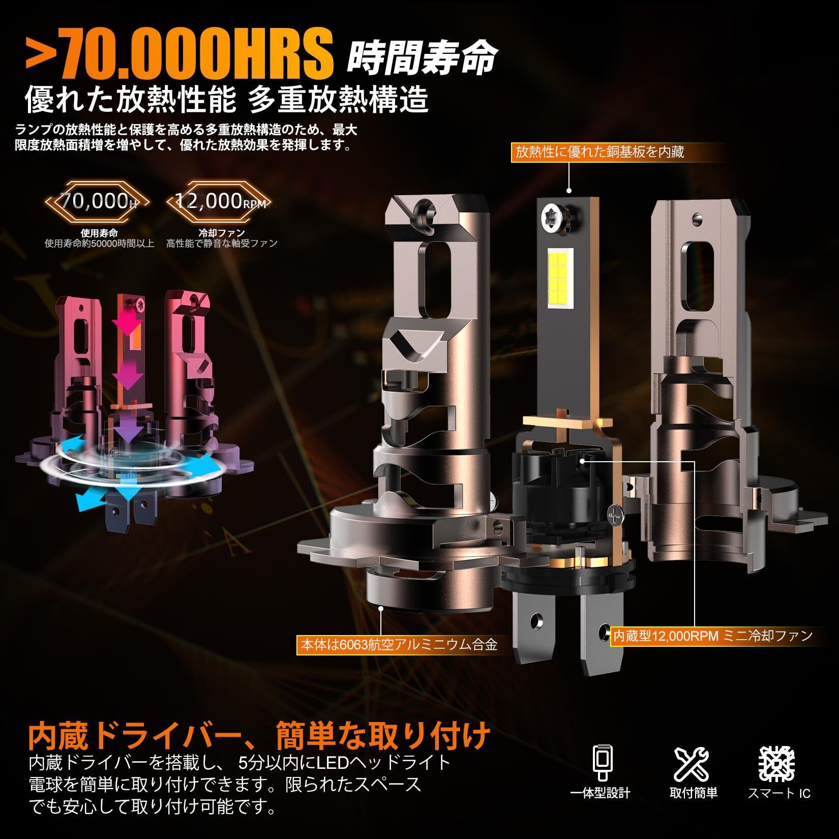 【四重放熱&IP68防水性能】4重放熱実現!四重放熱システムを採用し、銅基板+6063航空アルミ合金+冷却ファンのスーパー放熱率を実現!本体は航空級アルミニウム合金で作られていて、凹溝式設計最大限度放熱面積を増やして、放熱性能を大幅にUP!熱伝導と冷却効果が抜群!大雨、吹雪などの極端な条件下でも安全運転を確保できます。-40℃~+85℃動作環境でも0.1秒瞬間起動できます。IP68レベルの優れた防水性能で、短時間の浸水では全く影響は受けません。雨の日のドライブを安全、快適に!