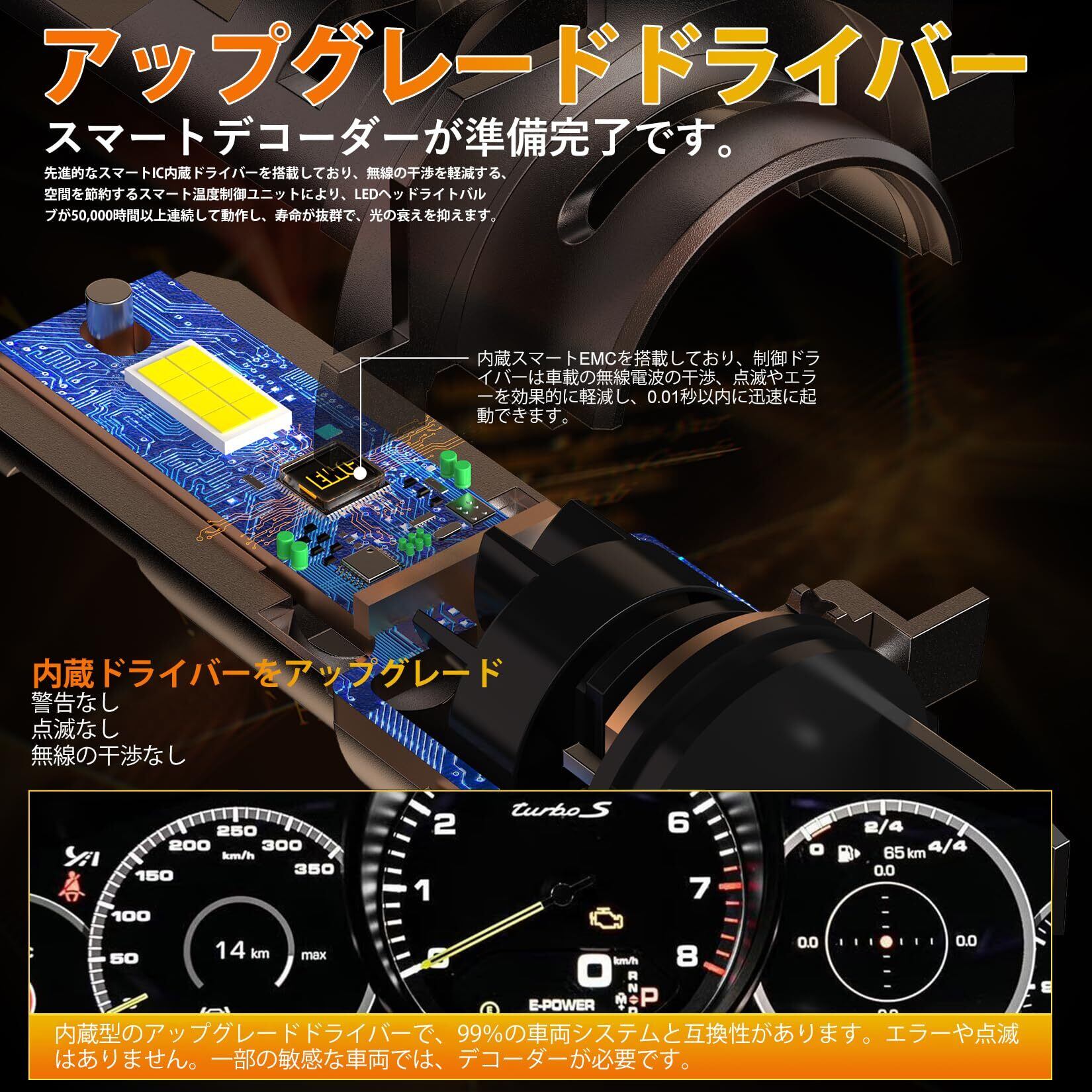 【業界最新の線型キャンセラーを搭載】この車用 H7 LED ヘッドライトは、H7 ヘッドライトタイプの車種の 99%に対応可能です。購入前に、お使いの車のヘッドライトとの互換性を確認してください。取り付け及び使用過程で何か問題が発生した場合(例:インジケーターの不点灯、点滅、エラー表示などの故障提示)、いつでも当社に連絡してください。当社は速やかに対応し、問題を解決いたします。ダッシュボードにエラーが表示された場合は、当社に連絡してデコーダーを入手すると解除できます。別途ワーニングキャンセラーを購入する必要はありません。(※本製品は業界最新の線型キャンセラーを搭載しており、日本の FM 周波数帯域に影響を及ぼしません。ラジオにノイズが入ることも、車の中央コンピューターに影響を及ぼすこともありません。)