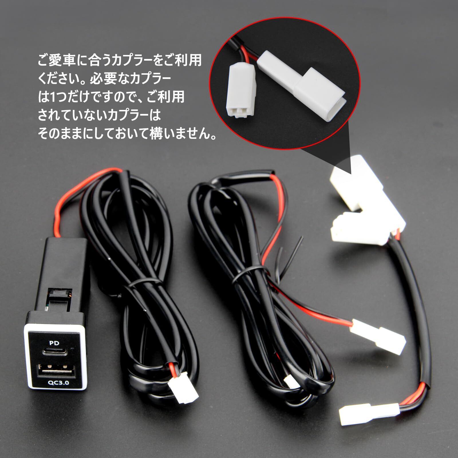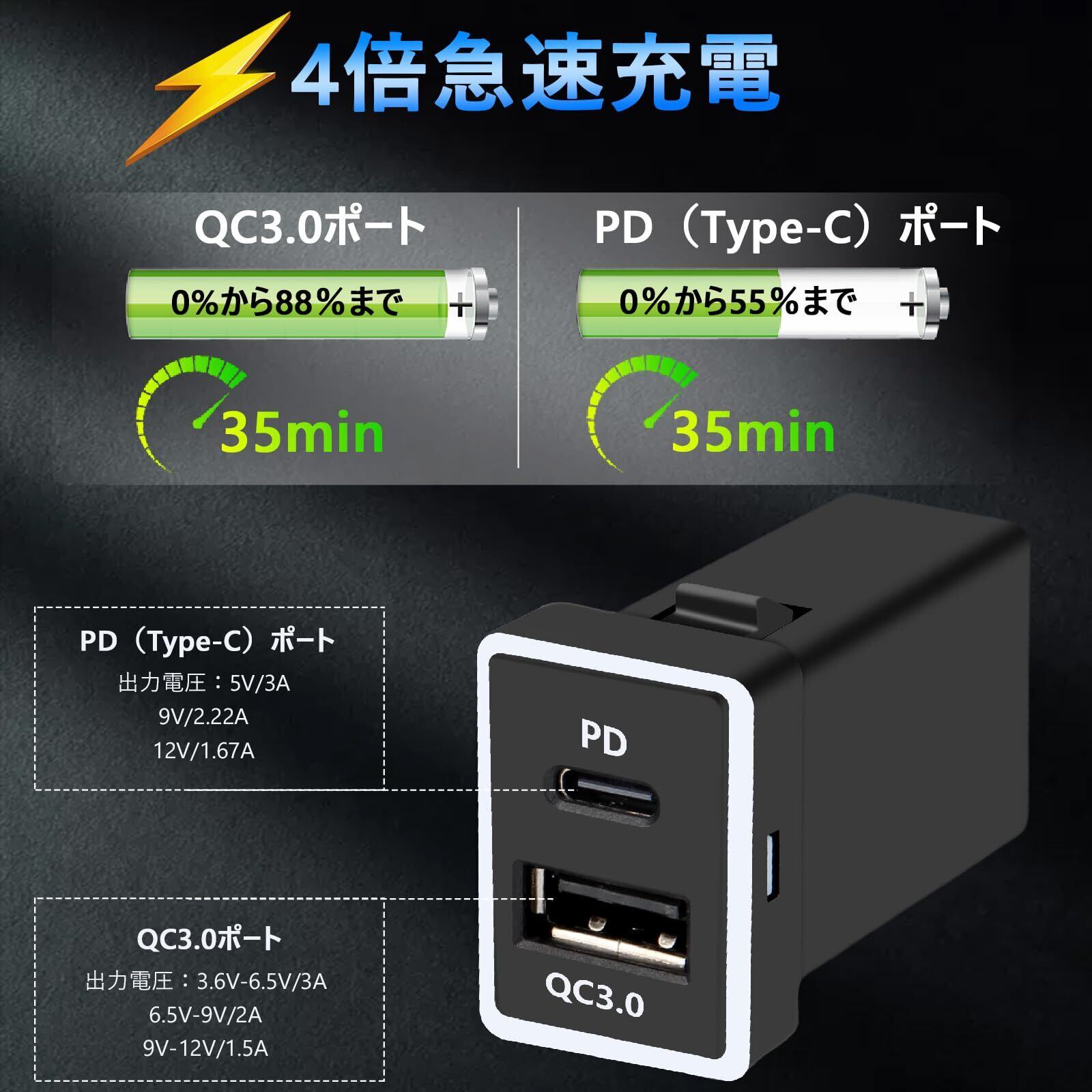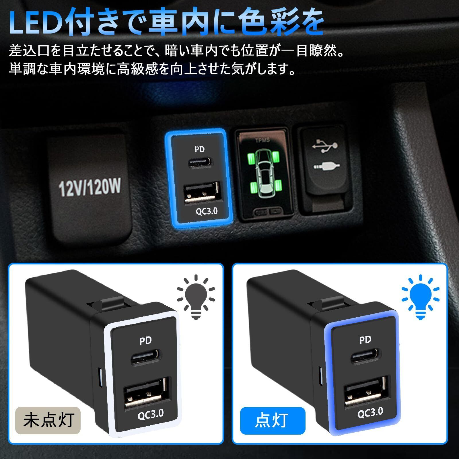 【4倍急速充電】トヨタ 車 usb ポート QC3.0 PD Type-C usb 増設 車 電源ソケット カーチャージャー ハイエース usb 増設ポート ハイエース 200系 スイッチホール シガーソケット スマホ充電 取り付け簡単 LED付き 発光色(ブルー)