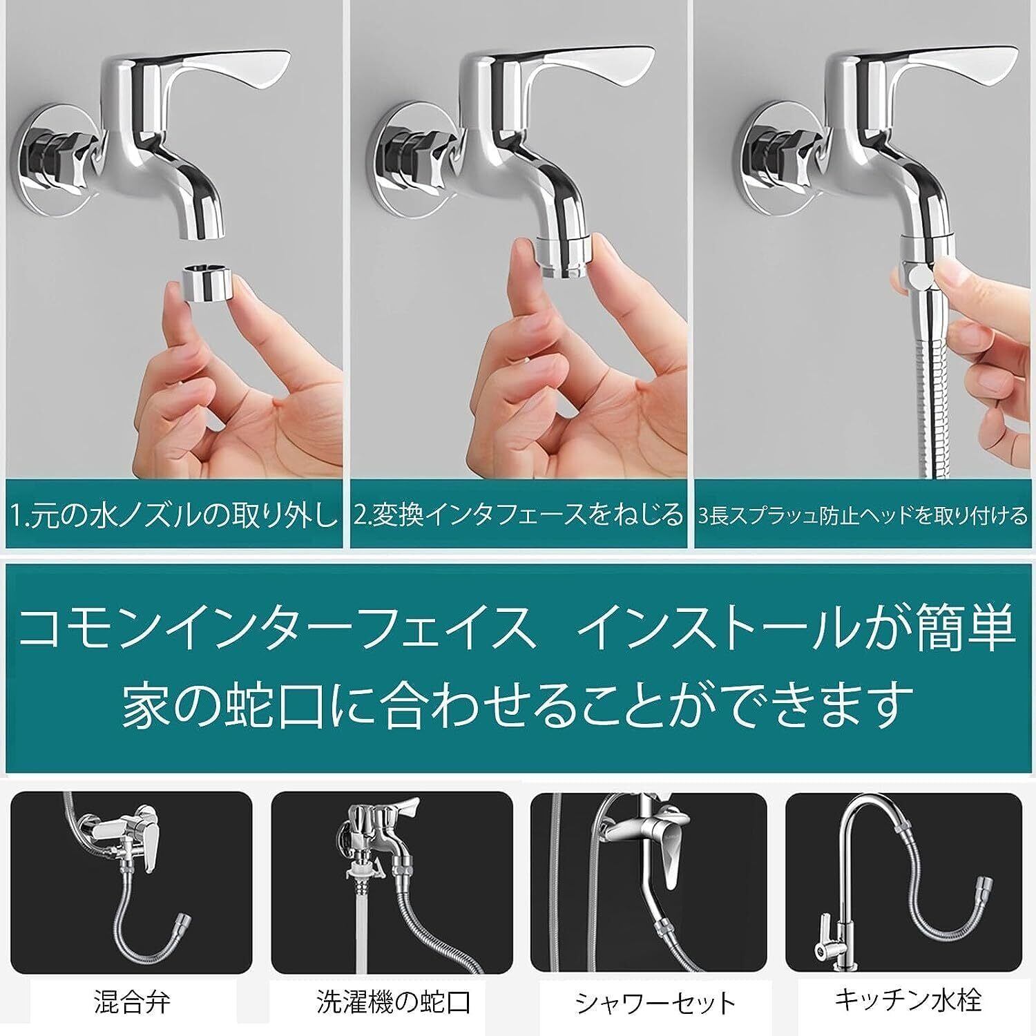 ご注意: インストール前には必ず蛇口自体のシャワー口を取り外してください。(取り外しないと、水漏れの可能性があります。) 付属の漏れ防止ワッシャー必ず本体に入れてください。