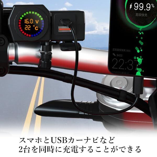 バイクUSB電源 バイク用 USB Type-Cポート USBポート QC3.0対応 温度表示 電圧表示 カラー液晶 防滴キャップ付き