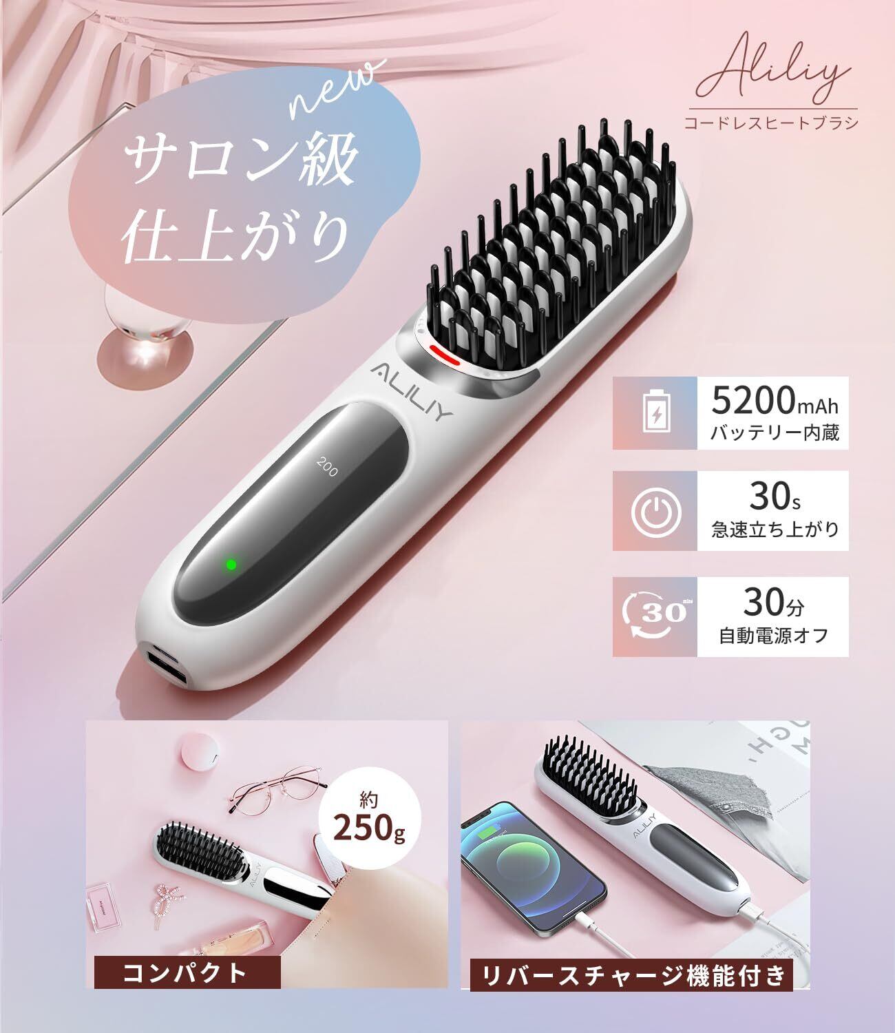 【コードレス・リバースチャージ・一台二役】ALILIY最新作のコードレスヒートブラシはコードレスのデザインを採用しましたので、配線の絡まる悩みがなく、コード式より便利に使えます。ミニサイズなので、持ち運びやすく、カバンにも入れられます。その上、モバイルバッテリーとしても使えます。外出先でスマホを充電することもできます。とても便利な一品!