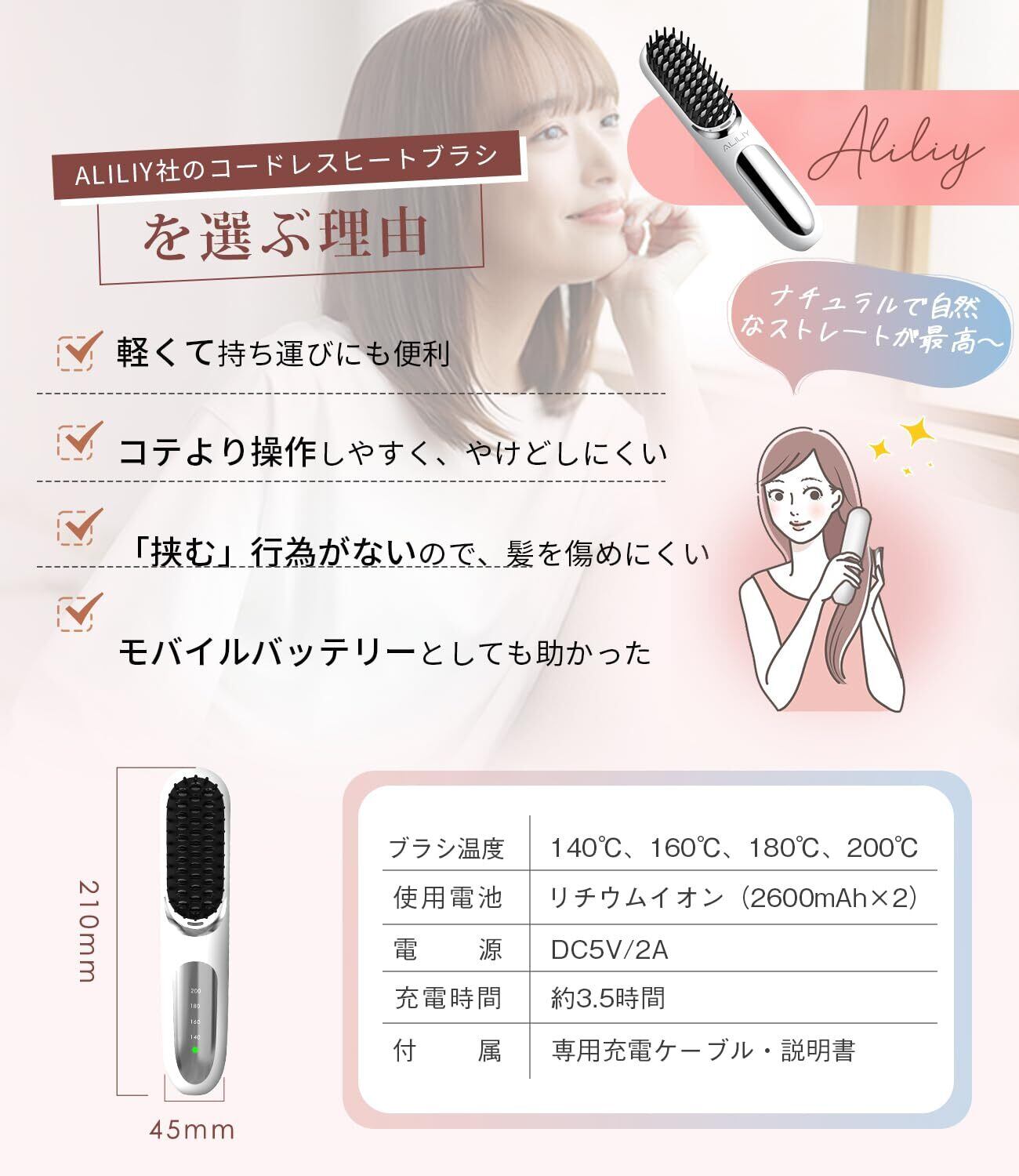 【千万級マイナスイオン発生・梳かすだけでサラツヤ髪になれ】ALILIY最新作のコードレスヒートブラシは、千万級マイナスイオン発生器を搭載しております。寝グセ・広がり・うねりの悩み全て解消します。マイナスイオンは静電気のようなプラスイオンを中和して、キューティクルの痛みからしっかりと守り、サロンから帰るのようなサラツヤ髪になれます。