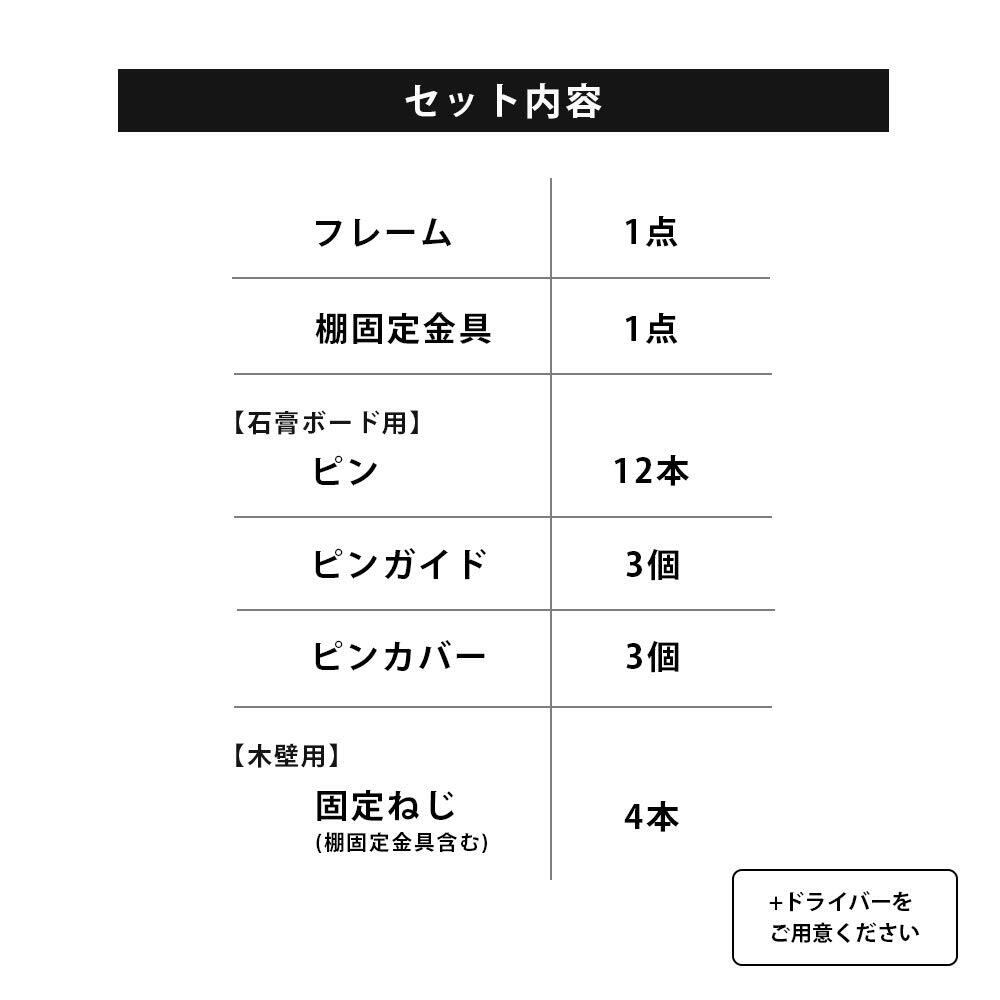 【セット内容】トライアングルフレーム1本、棚固定金具1個、固定ねじ4本、ピン12本(予備含む)、ピンガイド3個、ピンカバー3個、取扱説明書