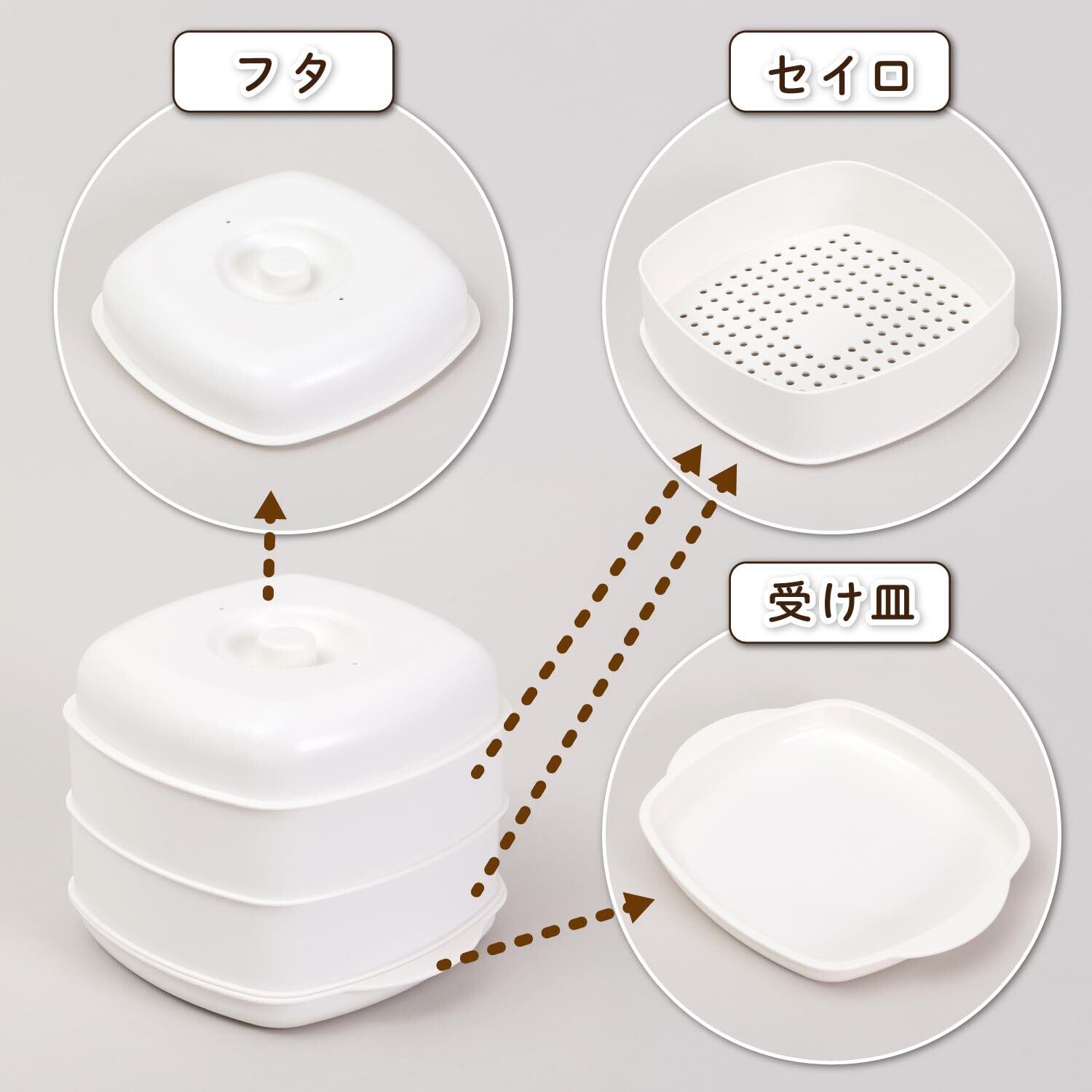 【商品仕様】:サイズ/縦156×横175×高さ131mm、カラー/ホワイト、内容/1個、セット内容/受け皿・フタ・セイロ×2、容量/300ml、耐熱温度/140℃(食洗機OK)、耐冷温度/-20℃、材質/ポリプロピレン(銀イオン無機系抗菌剤練り込み)、生産国/日本