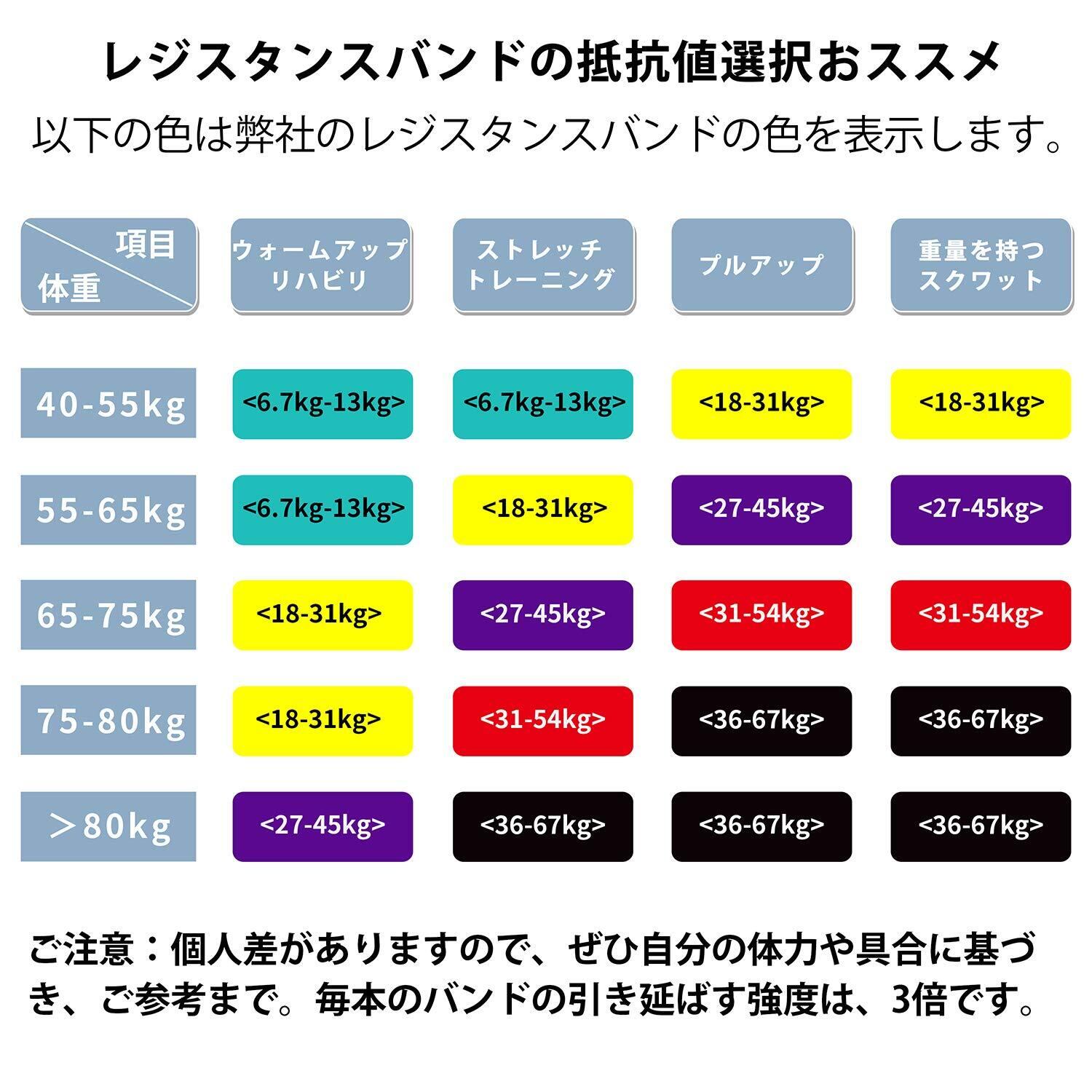 【5階段負荷のレジスタンスバンド·最大負荷67kg調整可能】:緑(6.7-13kg)、黄(18-31kg)、オレンジ(27-45kg)、赤(31-54kg)、黒(36-67kg)あなたは絵の指導と個人的な訓練のに基づいて適当なレジスタンスバンドをお選びください。全身トレーニングには、黄・オレンジ・赤のセットにおススメ。腕や肩のストレッチトレーニングためにはライトレジスタンスチューブをおススメ。足のスクワットまたは引き上げの高難度なトレーニングにはより強いレジスタンスチューブにおススメ
