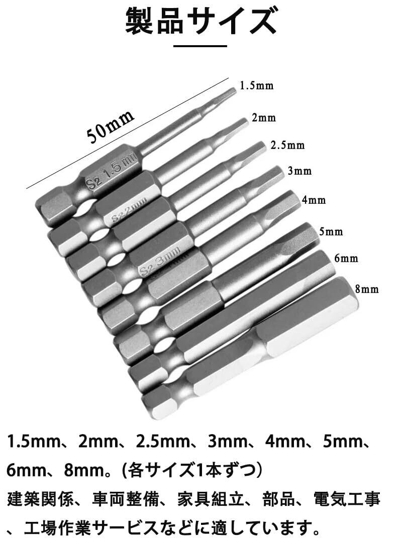 電動ドライバービットセット 8本セット 1.5mm-8mm S2合金鋼製 六角軸 便利な磁気吸着 全体熱処理 温度耐性 広範囲に適用 インパクトドライバー ビット 六角ドライバー 精密ドライバー