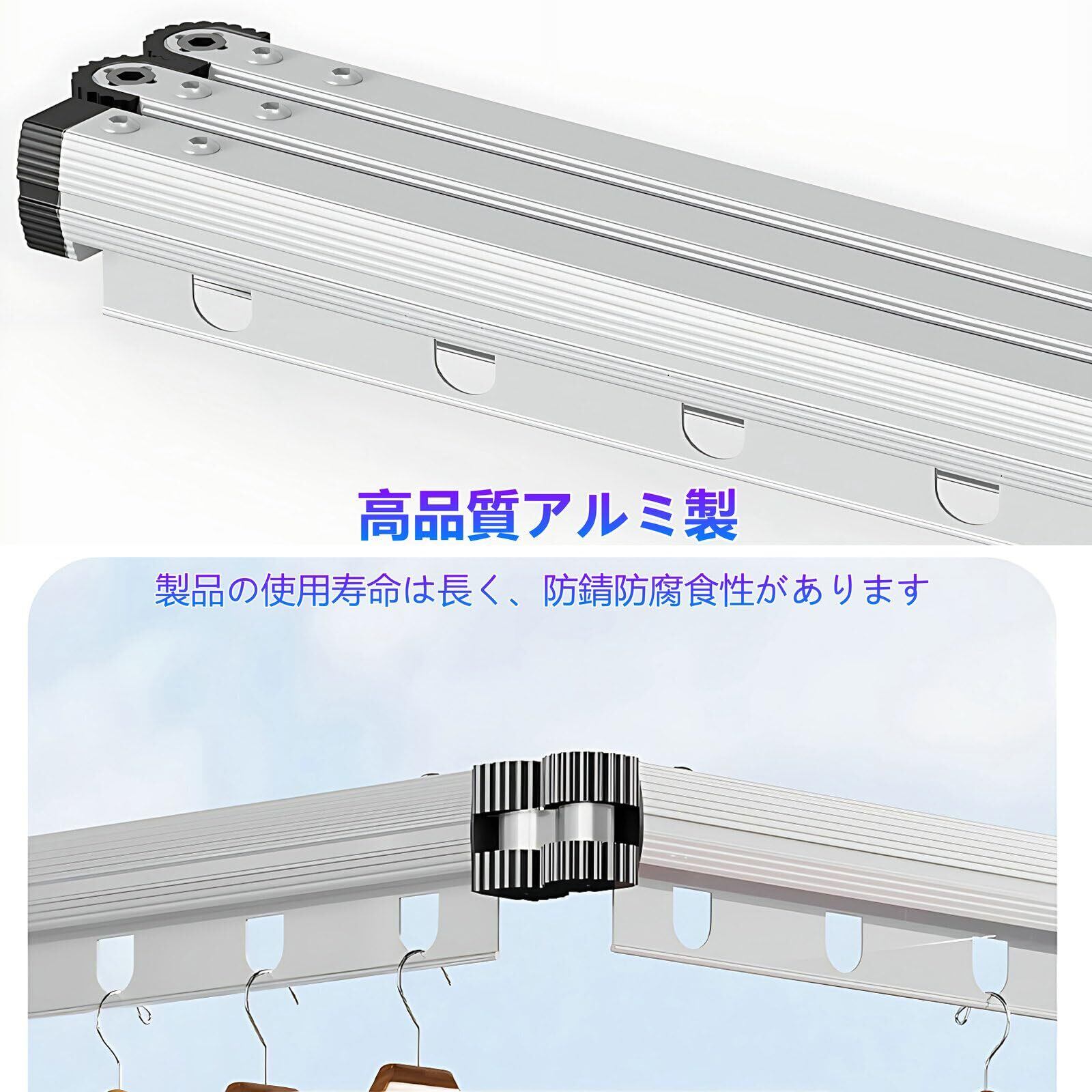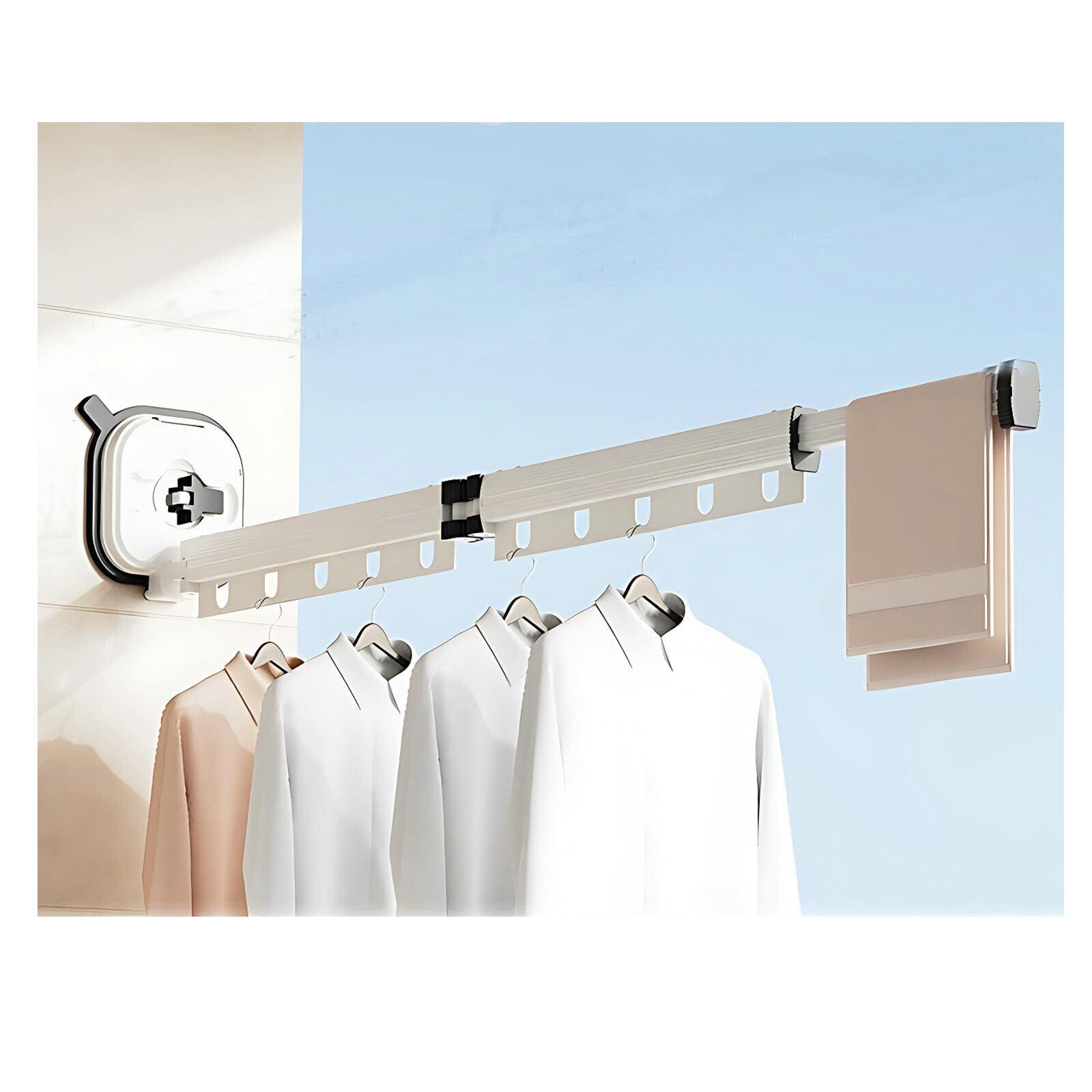 【省スペース】360度折りたたみ式、一段ごとに5個の防風フック、末端は25cm延長伸縮ロッドあり、タオル、ズボン、シャツを掛けることができます。使わないときは折りたたんで収納でき、360°回転・伸縮可能で使いやすいし、屋内でスペースをとらない利点があります