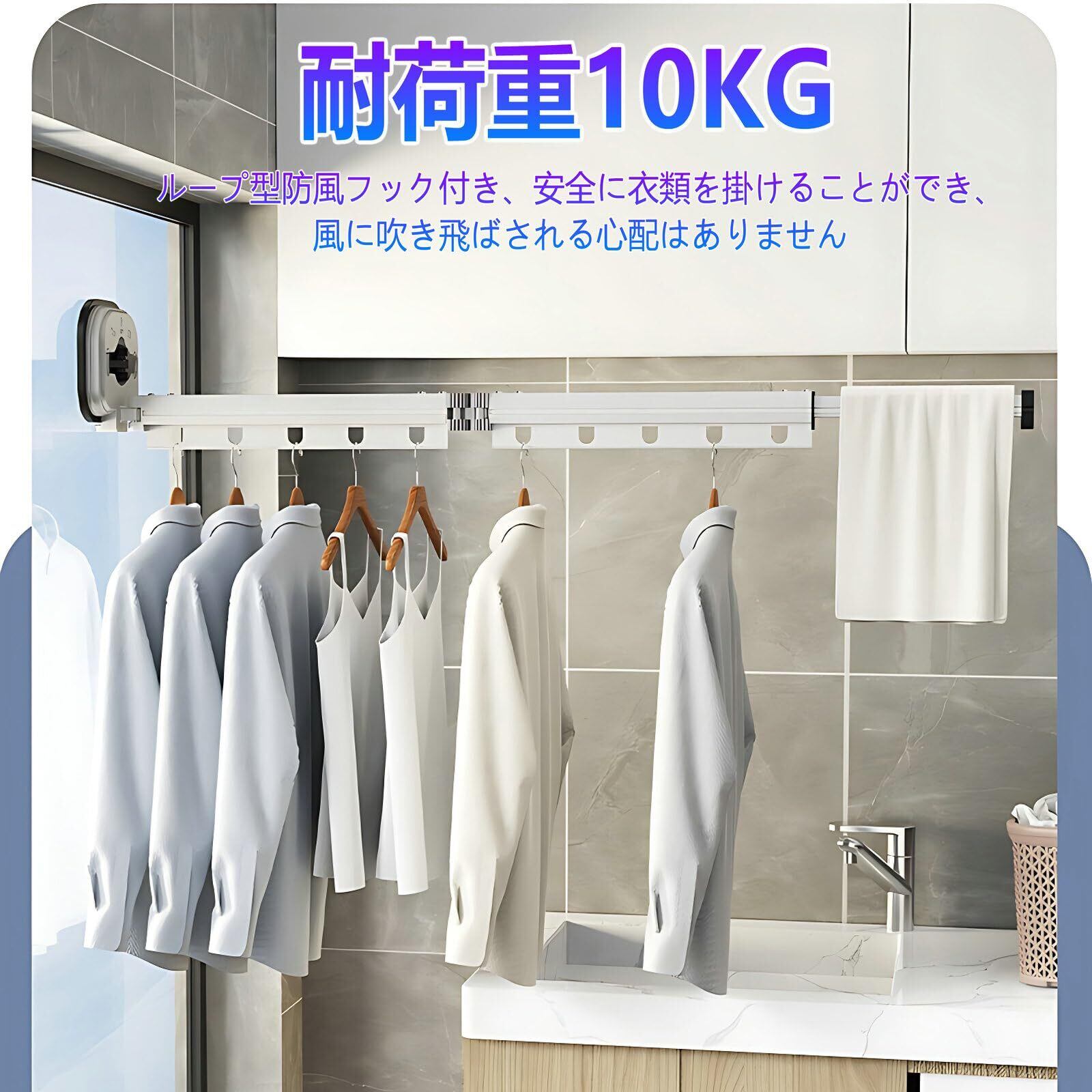 吸盤壁掛折りたたみ物干しラック 室内物干し 折畳み 室内家庭用バルコニー 穴あけ不要 部屋干し ラック 伸縮物干しポール アルミニウム合金素材 梅雨対策 吸盤乾燥ラック 寝室 バスルーム 折りたたみハンガー 省スペース 壁掛け 耐荷重10kg 3段15個の防風フック25cm延長伸縮ロッド付き (ホワイト-2段式)