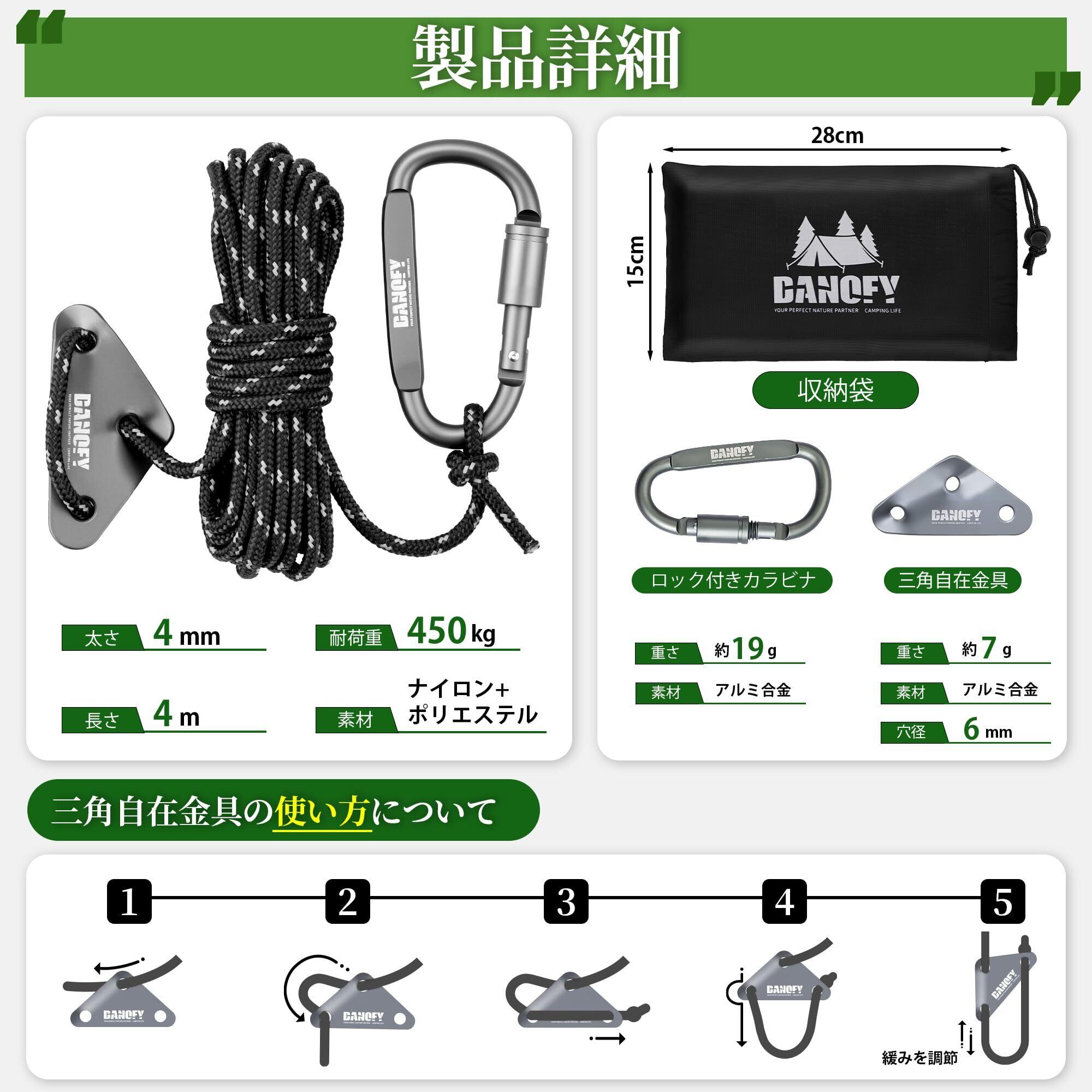 【カラビナと自在金具付き】各自在ロープにはアルミ製カラビナと三角自在金具が付属され、お届け後すぐに利用可能です。ねじ式カラビナをテントに連接するだけで、時短にタープの設営を完成し、風に当たってもしっかりとテントを止めます。三角自在金具付きで、自由自在にアウトドア ロープのゆるみの度合いを調節できます。急な雨や強風時でも素早く対処できます。