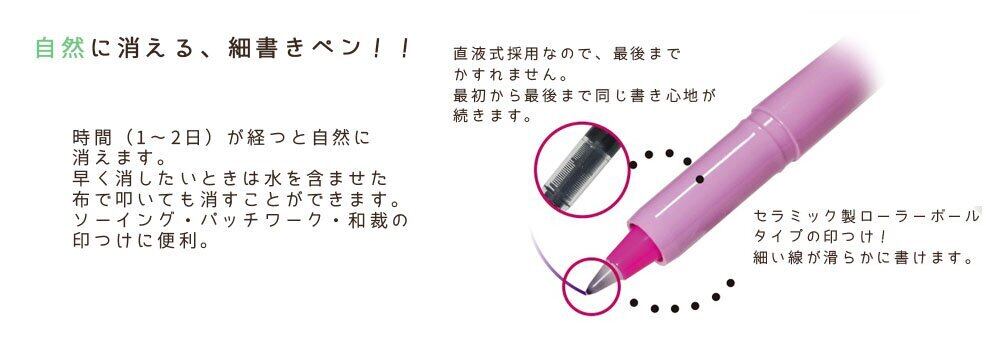 書いた しるし が1日~10日前後で 消える ペン です。( 湿度 や 温度 などの 環境 、 生地 の 素材 によって異なります。) ペン先が ボールペン タイプ で、 布 の上でコロコロ転がしてなめらかに書けるため、布を傷めず細く書くことができます。