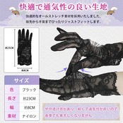 【総レース 黒手袋 優雅 通気】上質なフルレース素材で仕立てた手袋は、優美なフォルムでありながら、驚くほど快適にお召しいただけます。透けるほど軽やかで繊細なレース模様が、指先から手首まで優雅さを演出します。手首までをすっきりと覆うロングデザインが、フォーマルな場面はもちろん、特別な日の装いを格上げます。軽量で通気性に優れ、ほのかな透け感が涼やかな印象を与えるため、春夏の季節でも蒸れず、快適にお使いいただけます。