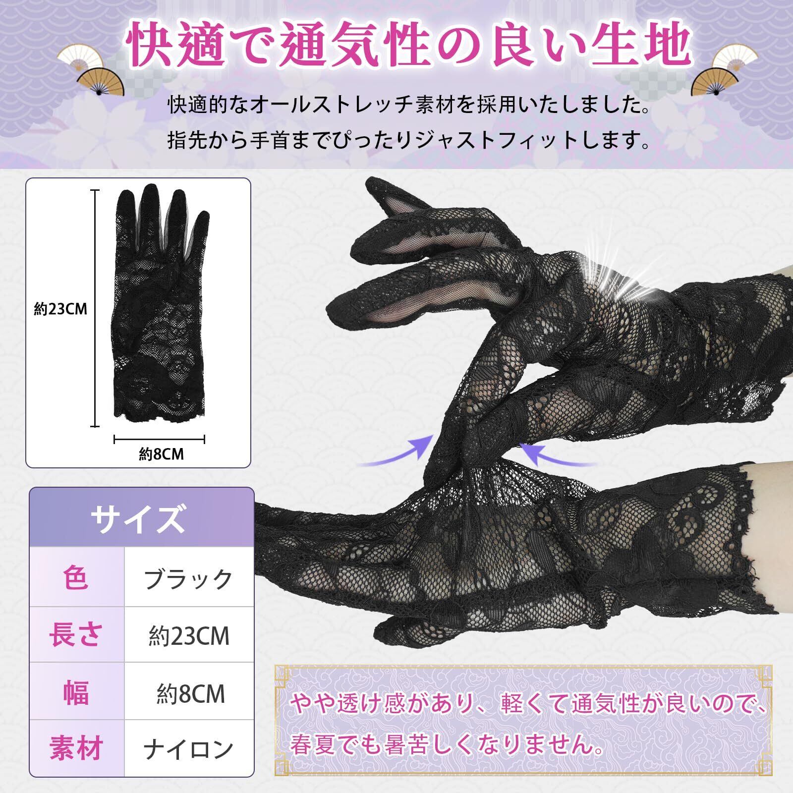 - 特徴:レース、通気性、薄手、ネイル隠し、喪服用