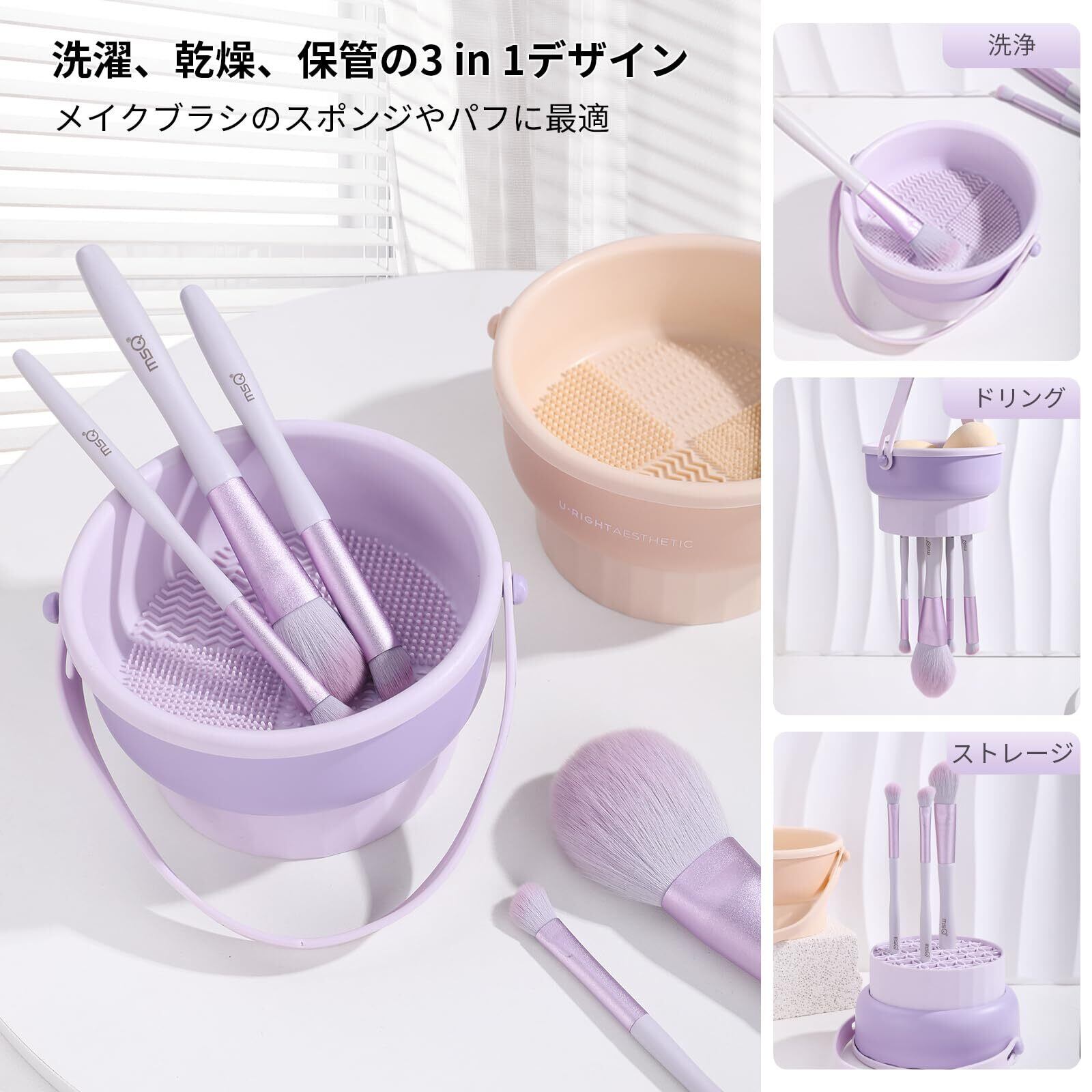 MSQ メイクブラシクリーナー 3in1 化粧ブラシ 洗浄・乾燥・収納 シリコン 大容量 吊り下げ可能 取り外し可能 置き台 洗浄 清潔 乾燥 おしゃれ無臭 パフクリーナー スポンジクリーナー (パープル)