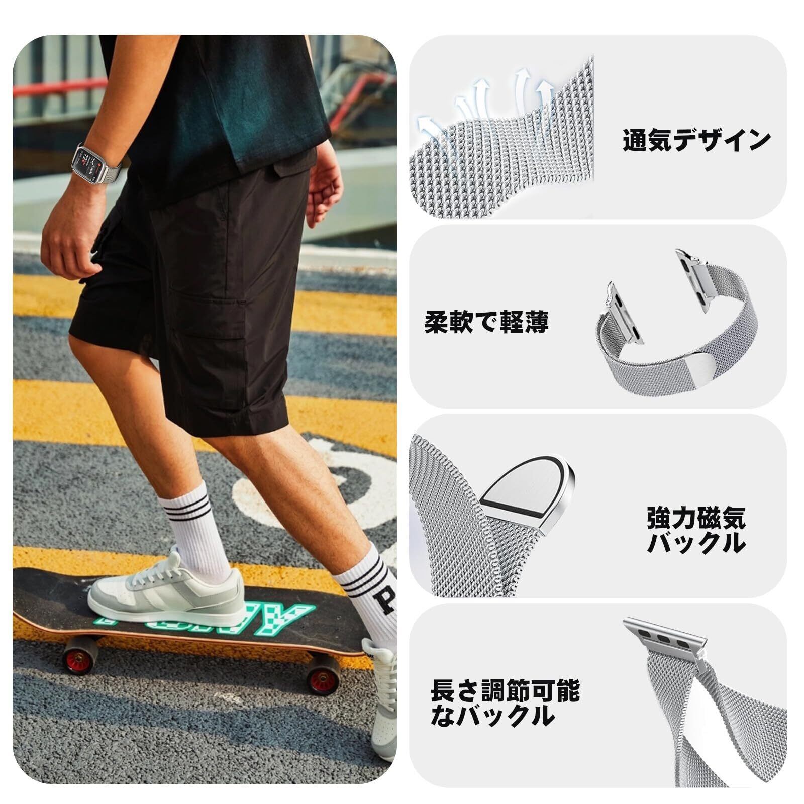 【優れた通気性】アップルウォッチ ベルトのデザインは通気性を考慮しており、メッシュ構造が手首周りの通気性を向上させ、汗をかく季節でも蒸れずに快適にご使用いただけます。着用時に優れた通気性を持つ、オフィスやジムでの使用に関わらず、手首のドライさと快適さを保つことができます。