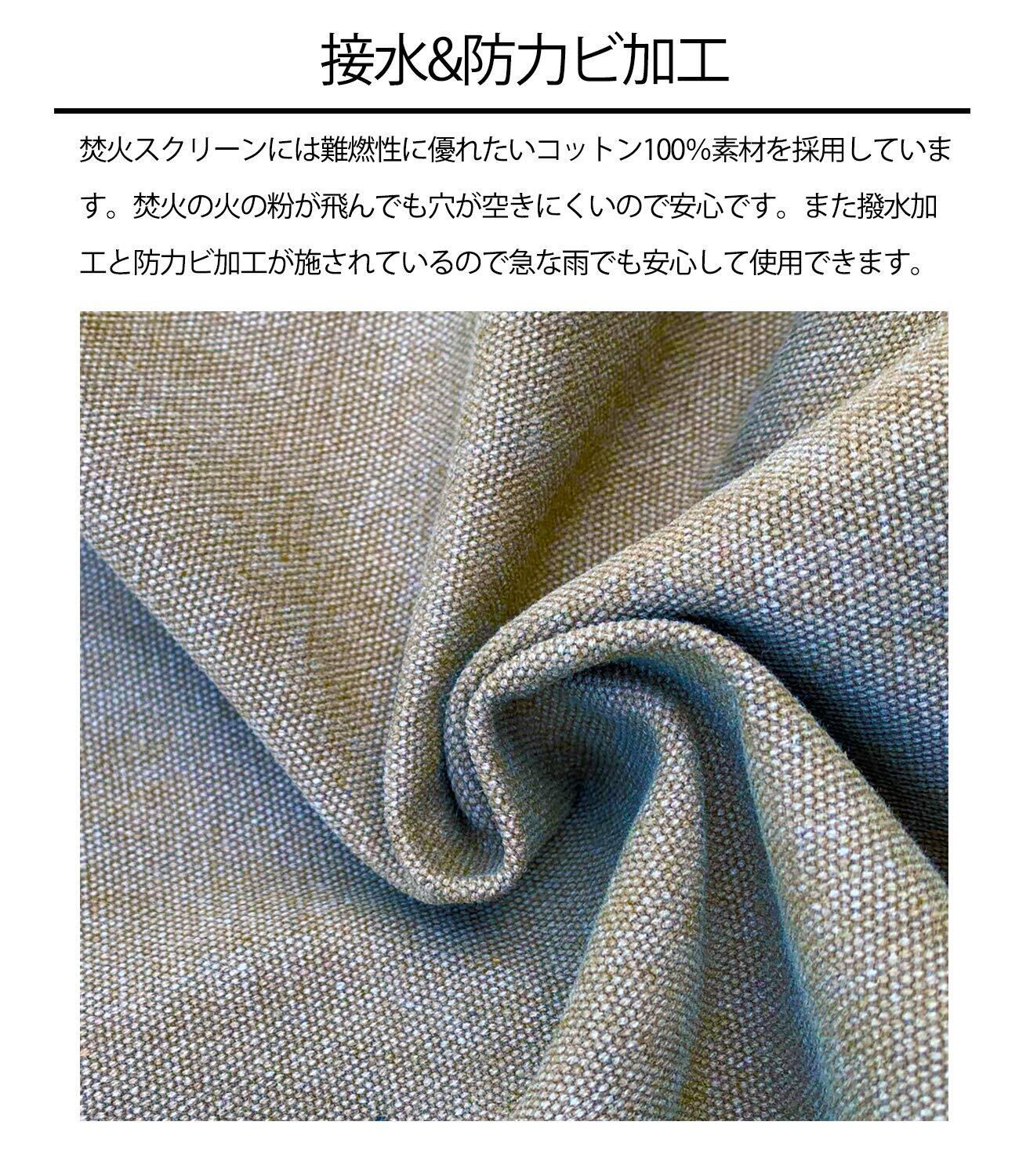 【火の粉に強いコットン100%素材を採用します】焚火スクリーンには難燃性に優れたいコットン100%素材を採用しています。焚火の火の粉が飛んでも穴が空きにくいので安心です。