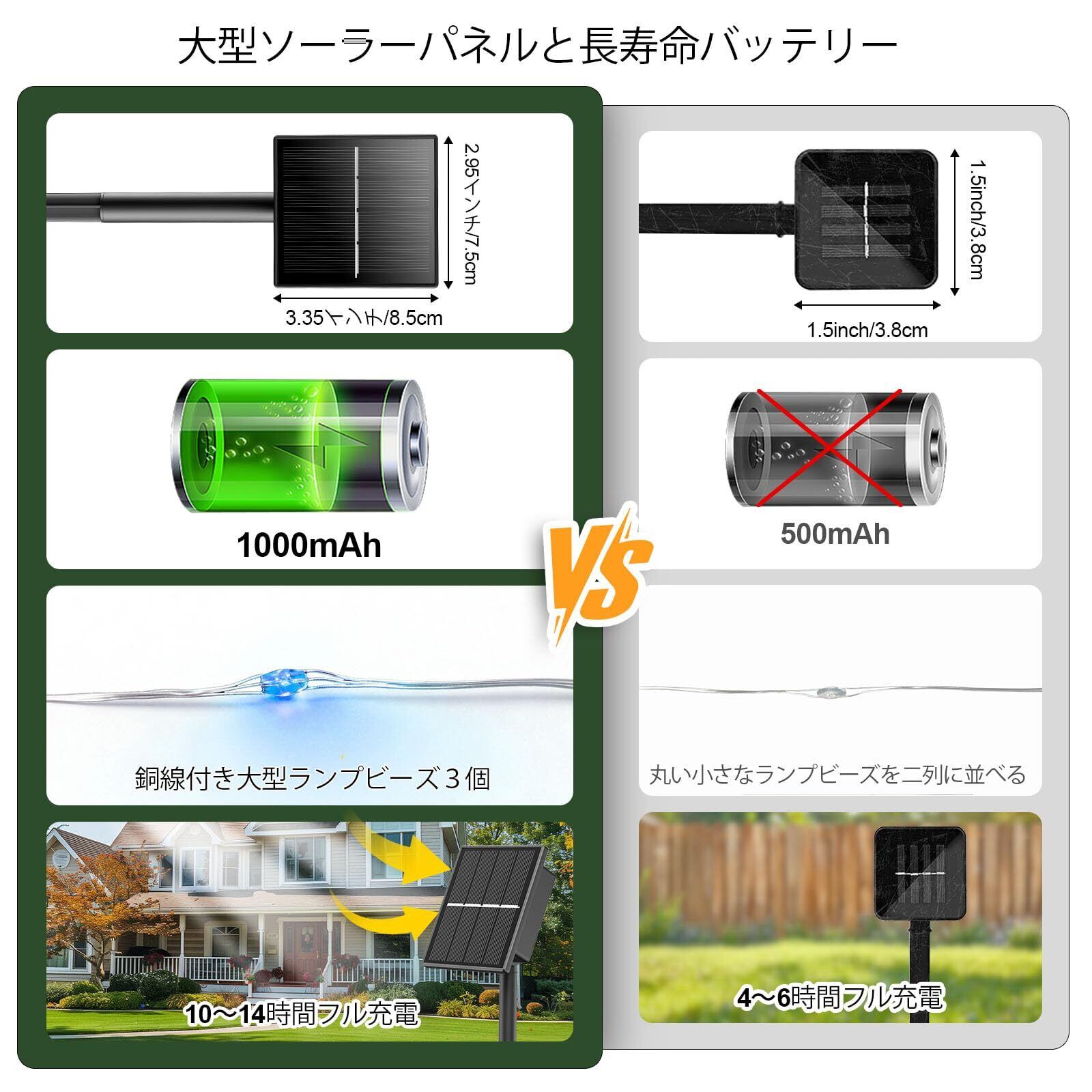 【8種類の点灯モード】屋外用 ソーラーライトは高品質のLED電球を使用しているため、 ライトの輝度は従来品より明るいです。一粒一粒が明るくてどの方向から見ても綺麗です。完璧な360度拡散発光も実現!全8種類の点灯モードがありますので、「Mode」ボタンを押すだけで、点灯モードを簡単に切り替えが可能です。パーティー、祝日に暖かい雰囲気を作成、美しい光が広がります、お庭や玄関、お店やショッピングマーケットの扉、ベッドや壁、部屋をお好きなように演出できます。