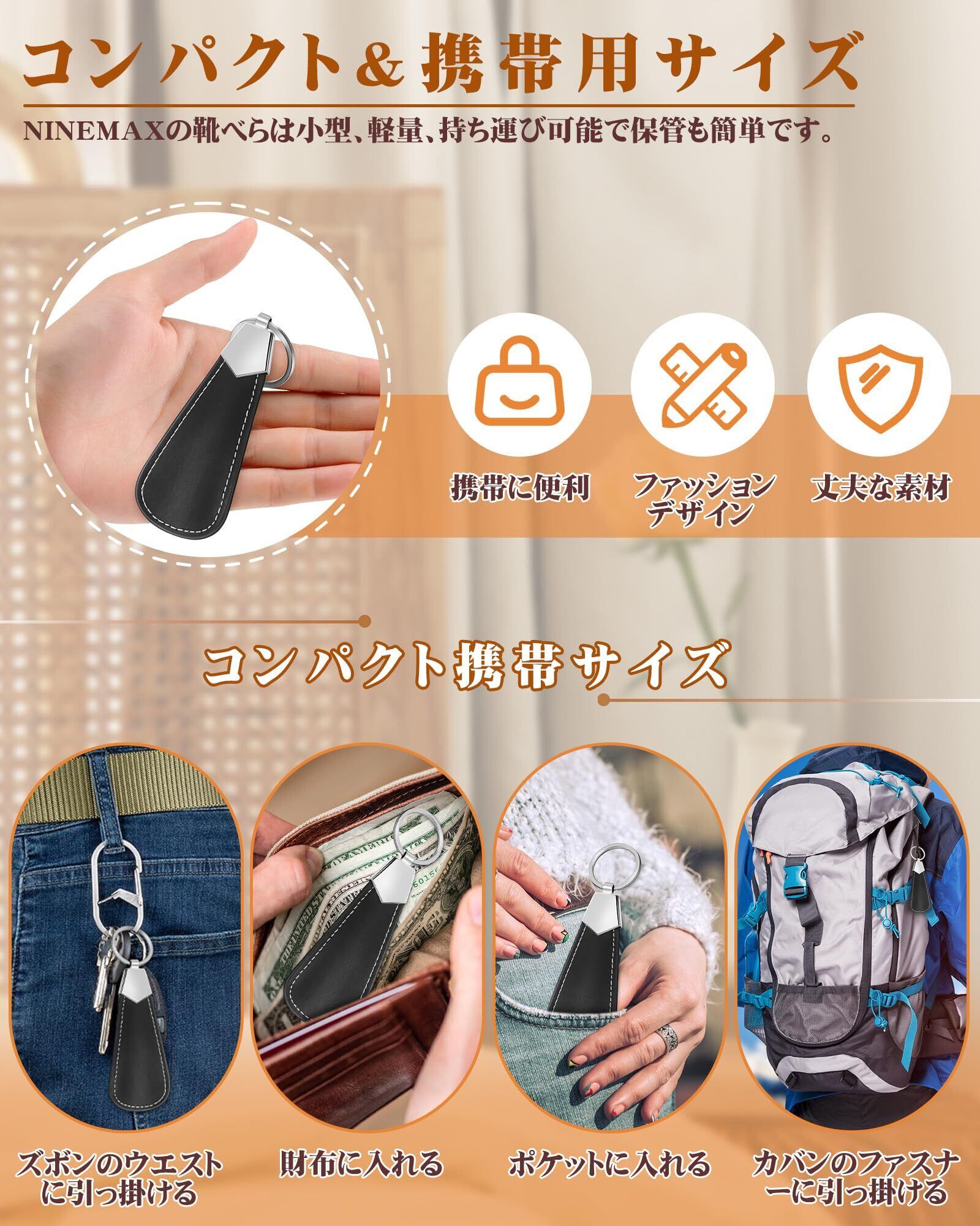 【コンパクト&携帯用サイズ】 NINEMAX の靴べらは小型、軽量、持ち運び可能で保管も簡単です。靴べらはキーホルダーとして使用したり、ポケットやバックパックに入れたりすることができ、手のひらに収まるサイズ感で、どこへでも持ち運びに非常に便利です。