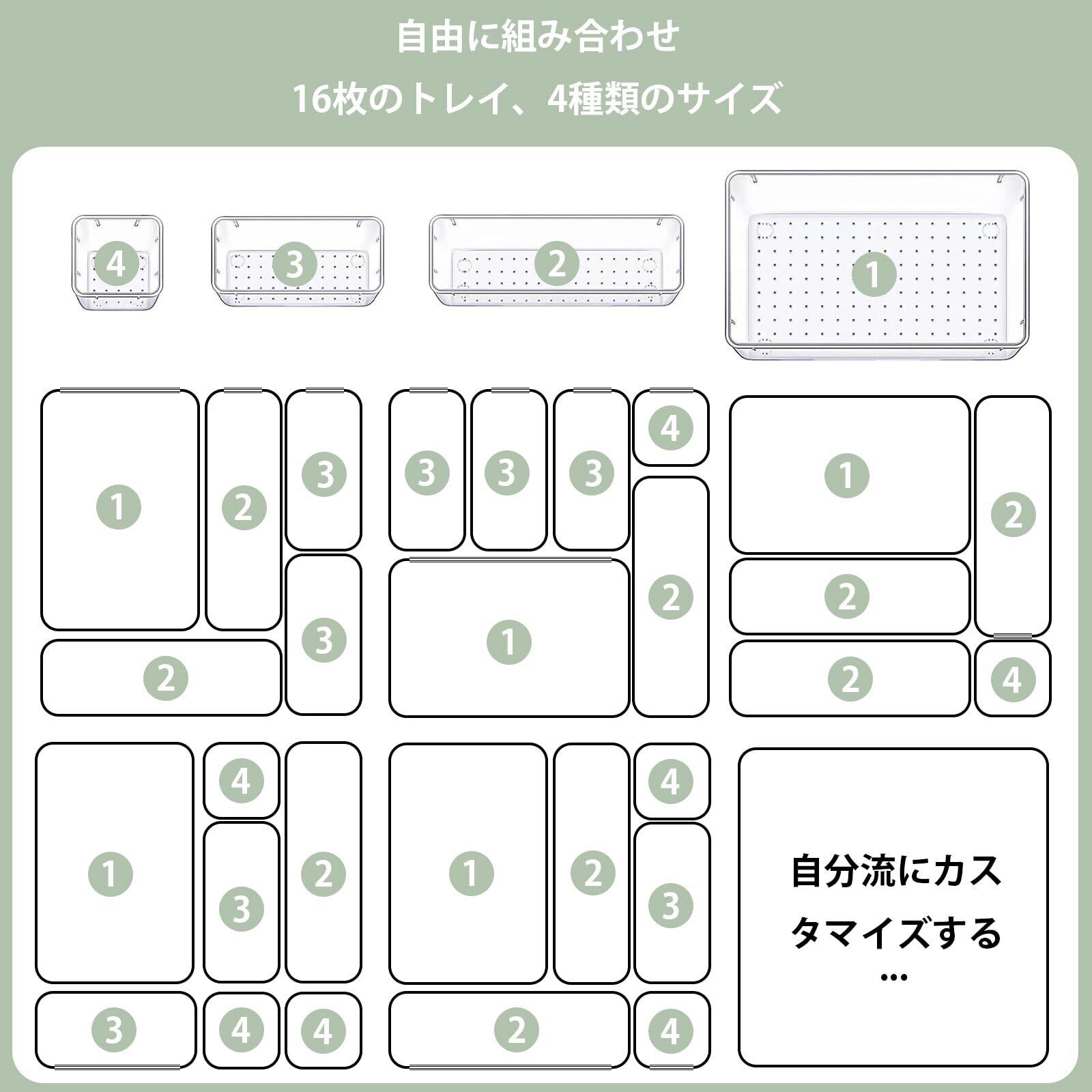 【4種サイズ】2個22.9*15.2*5.3cm、2個22.9*7.6*5.3cm、6個15.2*7.6*5.3cm、6個7.6*7.6*5.3cm。透明なデザインなので、必要なものをすぐに見つけることができます。100個の保護パッドが付きます。トレーの底に貼ると、引き出しとの直接摩擦による擦り傷を減らし、傷防止や騒音防止の役割を果たします。余計な保護パッドが他の家具にも貼れます。