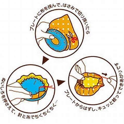 作り方は、プレートに布を挟んで、はさみで切り抜いたら、ぬいしろを押さえて、針と糸で縫い合わせ、プレートからはずして絞ります。