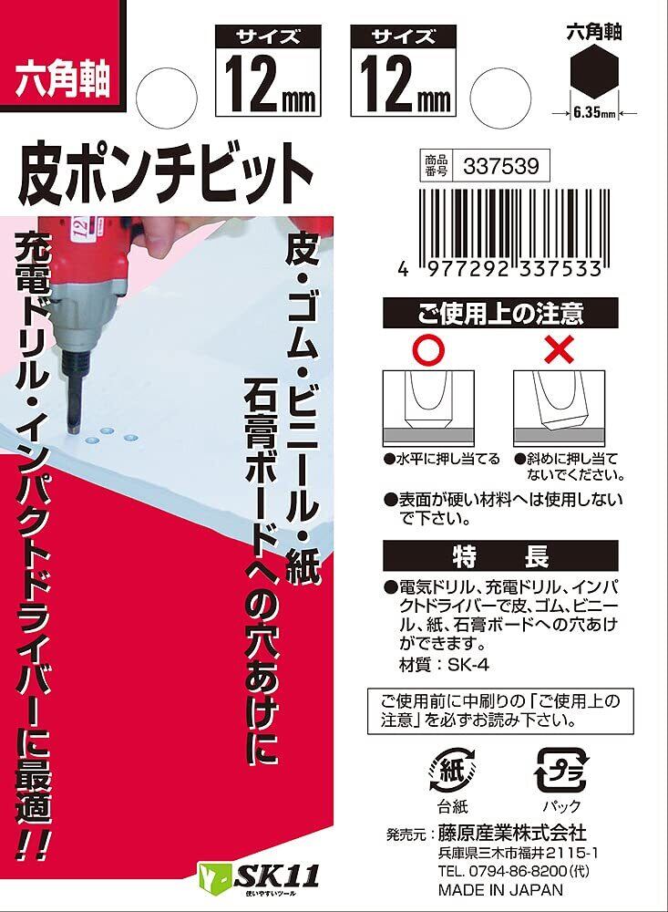 SK11(エスケー11) Y-SK11 六角軸皮ポンチビット 皮・ゴム・ビニール・紙・石こうボード用 12mm